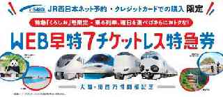 JR西日本グループ Release もっとつながる。未来が動き出す 2025年 3月21日 西日本旅客鉄道株式会社 特急「くろしお」号限定 乗る列車、曜日を選べばさらにおトクな! 「WEB早特7チケットレス特急券」を発売します JR西日本では、大阪・関西万博の開催を記念して、金・土・日に出発する対象の特急「くろしお」号に限り、期間限定で「WEB早特7チケットレス特急券」をさらにおトクなキャンペーン価格で発売します! 万博を訪れたあとは、「プラスワントリップ」の旅先として、魅力いっぱいの夏の和歌山へお出かけください。 1.商品概要 ○発売期間 2025年4月9日(水)〜2025年7月27日(日) ※ご利用日の1ヶ月前から7日前までの発売となります。 ○利用期間 2025年5月9日(金)〜2025年8月3日(日)の金・土・日出発限定 ※7月21日(月・祝)は除きます。 ○対象列車 特急「くろしお」号の一部列車 和歌山方面:3号/5号/25号/27号 大 阪方面:4号/10号/14号/28号/30号 2.主な設定区間・発売額(おとな1名様/片道/普通車指定席/通常期) ┌───────┬─────────────┬──────┐ │ 主な区間 │ WEB早特チケットレス特急券│ <参考> │ │ │キャンペーン価格│通常価格│通常のきっぷ│ ├───────┼────────┼────┼──────┤ │新大阪〜和歌山│ 600円 │ 1,120円│ 1,730円 │ │新大阪〜白 浜│ 950円 │ 1,770円│ 2,730円 │ │新大阪〜新 宮│ 1,030円 │ 1,910円│ 2,950円 │ └───────┴────────┴────┴──────┘ ※上記は特急券のみのおねだんです。 別途、乗車券(きっぷ・定期券・ICOCAなど)が必要です。 ※その他区間やこども用の設定もあります。 本キャンペーン価格は京都発着列車の設定はありません。 ※通常期・繁忙期でおねだんが異なります。 3.その他 ・JR西日本インターネット予約サービス「e5489」・クレジットカード決済限定です。 ・このきっぷで予約いただける座席数には限りがあります。そのため、ご希望の列車に空席がある場合でも、このきっぷにより予約いただけない場合があります。 ・ご利用期間中の月〜木(祝日含む)や、対象列車以外をご利用される場合は、「WEB早特7チケットレス特急券」の通常価格となります。ご購入の際は、出発日・列車・おねだんをご確認ください。 発売条件やご利用条件など詳しくは、専用サイトでご確認ください。 【URL】https://www.jr-odekake.net/goyoyaku/campaign/kuroshio-web-hayatoku7/ |