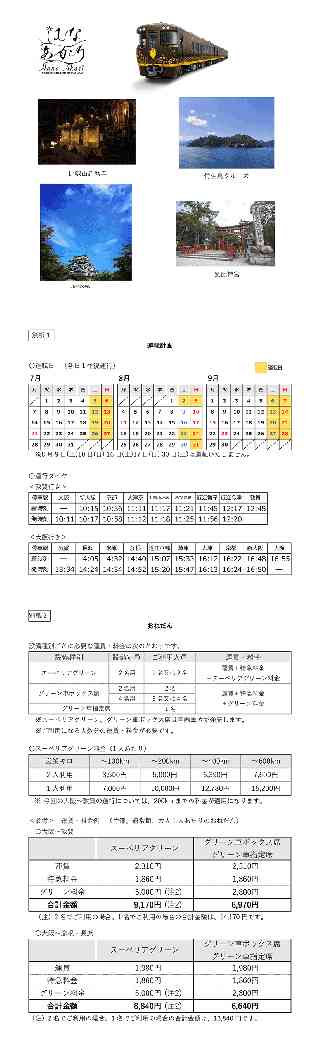 JR西日本グループ Release もっとつながる。未来が動き出す 2025年 4月17日 西日本旅客鉄道株式会社 大阪・関西万博に合わせたプラスワントリップに 観光列車「はなあかり」 2025年夏 大阪〜敦賀間運行!! 観光列車「はなあかり」の2025年夏季の運転計画が決まりましたのでお知らせいたします。 「地域の華を列車に集め、お客様と地域の縁を結ぶ列車」をコンセプトに、エリアを変えながら西日本各地を運行するこの列車は、この夏は大阪から敦賀までを琵琶湖の西岸と東岸でルートを変えて結びます。長浜・彦根・近江八幡などの歴史浪漫溢れる城下町や琵琶湖の絶景などが楽しめる滋賀県や足を延ばした北陸へのご旅行、大阪・関西万博に合わせたプラスワントリップでのおでかけに、ゆったりとした贅沢な旅をお楽しみください。 1.運転計画 別紙1 (1)運転開始日 2025年7月5日(土) (2)運転区間 大阪〜敦賀(行先により経路を変えて運転) 敦賀行:東海道本線・湖西線・北陸本線経由 大阪行:北陸本線・東海道本線経由 (3)運転期間 2025年7月5日(土)〜9月28日(日)の間の土日 【各日1往復運行】 全21日・42本 ※8月9日(土)10日(日) 16日(土)17日(日) 30日(土)を除きます 2.おねだん 別紙2 運賃・料金例 (片道、通常期、大人1人あたりのおねだん) ┌────────────┬───────┬────────┐ │ │ 大阪〜敦賀 │大阪〜彦根・長浜│ ├────────────┼───────┼────────┤ │スーペリアグリーン(注)│ 9,170円 │ 8,840円 │ ├────────────┼───────┼────────┤ │ グリーン車指定席 │ 6,970円 │ 6,640円 │ └────────────┴───────┴────────┘ (注)2名でご利用の場合 3.きっぷの発売箇所 ・全国の駅のみどりの窓口および主な旅行会社窓口 ・JR西日本インターネット予約「e5489」 ※グリーン車指定席は、JR西日本インターネット予約「e5489」の「観光列車チケットレス」も設定します。窓口に並ぶことなくお手元のモバイル端末で「特急券」の購入が可能で、きっぷの受取をせずスムーズにご利用いただけます。運賃部分は別途必要です。 グリーン車ボックス席(2名用・4名用)およびスーペリアグリーン車の設定はございません。 ※2025年4月1日より、すべての設備種別で座席を選んでお求めいただける「シートマップ」をご利用いただけるようになりました。 ・2025年6月5日(木)10:00から発売開始します。 ※グリーン車指定席は、「e5489」の事前申込サービスをご利用いただけます。 4.おもてなし (1)食のサービス 地元ならではの食材を使用した食のサービスを、事前予約限定で販売する予定です。 詳細は改めてお知らせいたします。 (2)駅や車内でのおもてなし アテンダント3名が乗車し、地域ならではのお土産品や飲料、「はなあかり」グッズを販売します。 駅でのお出迎えや車内での地産品の販売などお客様と地域を結ぶふれあいの場を一部日程でご用意します。詳細は改めてお知らせいたします。 5.車内の調度品 スーペリアグリーン車飾り棚の調度品を滋賀県の工芸品・アート作品に入れ替えます。詳細は改めてお知らせいたします。 6.特別な旅行商品 一部、「tabiwaトラベル」で旅行商品を販売する予定です。きっぷの通常販売に先行してお求めいただけます。詳細は改めてご案内いたします。 観光列車「はなあかり」に関する詳細は、「はなあかり」特設サイトでご案内いたします。 https://www.jr-odekake.net/railroad/hanaakari/ 7.停車駅からのおすすめ観光地 (1)比叡山延暦寺(比叡山坂本駅下車) 延暦7年(788年)に最澄が開創した、1,200年以上の歴史を持つ天台宗の総本山。 比叡山全域が境内で、東塔(とうどう)・西塔(さいとう)・横川(よかわ)と3つのエリアに分かれています。 東塔に建つ、延暦寺の総本堂「根本中堂」には、1200年もの間一度も消したことのない「不滅の法灯」が灯り続けています。 1994年には、ユネスコ世界文化遺産に登録された、滋賀・京都を代表する寺院です。 (2)竹生島クルーズ(近江今津駅、長浜駅下車) パワースポットとして知られる竹生島には、竹生島クルーズで雄大なびわ湖の景色を楽しみながら、約30分で訪れることができます。今津港・長浜港から乗船できるので、前後のご旅行予定にあわせてお好きな航路をお選びいただくことができます。古くより神様が棲む島として人々の信仰を集める島、竹生島。島内は国宝の宝厳寺唐門や都久夫須麻神社本殿、重要文化財の宝厳寺船廊下など見どころいっぱいです。 (3)彦根城(彦根駅下車) 彦根城は慶長9年(1604)に工事が始まり、約20年かけて完成した近世城郭です。 かつての彦根城は、三重の堀・人工河川(現・芹川)や城下町を含む大城郭でした。 その中で、中堀より内側の範囲は、石垣で構成された城郭平面構造が極めて良好な形で残っていることから、昭和26年に国の「史跡」、同31年には「特別史跡」に指定されており、国民共有の財産として大切に守られています。 彦根城