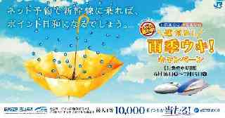 JR西日本グループ Release もっとつながる。未来が動き出す 2025年 5月16日 西日本旅客鉄道株式会社 山陽新幹線・北陸新幹線のご利用で2人に1人当たる! 「雨季ウキ!運だめしキャンペーン」の開催について 山陽新幹線、北陸新幹線をネット予約でご利用いただいた方を対象に、抽選でWESTERポイントが当たるキャンペーンを開催します。 \2人に1人、最大で1万ポイントが当たるチャンス!/ ぜひこの機会にネット予約で新幹線に乗れば、“ポイント日和”になるでしょう。 1.対象乗車期間 2025年6月16日(月)〜2025年7月15日(火) 2.対象区間 一部でも山陽新幹線(新大阪〜博多)、北陸新幹線(敦賀〜上越妙高)を含む区間 3.対象商品 「e5489」または「EXサービス」(エクスプレス予約・スマートEX)の商品 4.特典内容 山陽新幹線、北陸新幹線それぞれのご利用分に対して抽選を実施します。 【山陽新幹線】 山陽新幹線の対象区間・商品を期間中総額500円以上ご利用いただいた方を対象に抽選を実施し、2人に1人の確率で以下の通りWESTERポイントをプレゼントいたします。 ・1等: 5,000名に 10,000ポイントをプレゼント ・2等: 5,000名に 5,000ポイントをプレゼント ・3等:25,000名に 1,000ポイントをプレゼント ・雨季ウキ賞:1等〜3等以外の当選者に50ポイントをプレゼント ※さらに期間中1度でも「EXサービス」をご利用すると当選確率が上がります。 (通常1IDにつき応募口数が1口のところ2口となります。) 【北陸新幹線】 北陸新幹線の対象区間・商品を期間中総額500円以上ご利用いただいた方を対象に抽選を実施し、2人に1人の確率で以下の通りWESTERポイントをプレゼントいたします。 ・1等: 2,500名に 10,000ポイントをプレゼント ・2等: 2,500名に 5,000ポイントをプレゼント ・3等:15,000名に 1,000ポイントをプレゼント ・雨季ウキ賞:1等〜3等以外の当選者に50ポイントをプレゼント ※さらに期間中1度でもチケットレス商品をご利用すると当選確率が上がります。 (通常1IDにつき応募口数が1口のところ2口となります。) 5.その他 ・本企画への参加にエントリーは不要です。 ・上記以外にも各種条件がございますので、応募にあたっては特設サイトを必ずご確認ください。 ※特設サイト(2025年5月21日(水)14時頃に公開予定): https://wester.jr-odekake.net/campaign/detail/012026052101 【別紙】キャンペーン詳細 対象乗車期間 2025年6月16日(月)〜2025年7月15日(火) 対象のお客様 【山陽新幹線】e5489またはEXサービス(エクスプレス予約・スマートEX)で、対象区間、対象商品を期間中総額500円以上ご利用いただいたお客様。 【北陸新幹線】e5489で、対象区間、対象商品を期間中総額500円以上ご利用いただいたお客様。 ※「e5489」ご利用の方は、WESTER IDでログインしてご予約ください。 ※ スマートEXご利用の方、ならびにJR東海エクスプレス・カード会員、JQ CARDエクスプレス会員の方は、ご予約前に「EXサービスポイント付与登録」が必要です。 ※ J-WESTカード(エクスプレス)会員の方は、手続き不要です。 ※ スマートEX海外向けサービス会員、エクスプレス予約の一部法人モデル会員等、一部会員を除きます。 対象区間 【山陽新幹線】一部でも山陽新幹線(新大阪〜博多)を含む区間 【北陸新幹線】一部でも北陸新幹線(敦賀〜上越妙高)を含む区間 対象商品 【山陽新幹線】e5489またはEXサービス(エクスプレス予約・スマートEX)の商品 【北陸新幹線】e5489の商品 ※ 乗車券のみのご購入は対象外です。対象区間の特急券をご購入いただき、新幹線をご利用いただくと対象になります。 ※ 駅のみどりの窓口や旅行会社等でJ-WESTカード決済によりご予約・ご購入されたきっぷは対象外です。 ※「e5489」は、予約操作時に登録されているクレジットカードでの決済が必要です。 コンビニ・金融機関でのお支払い、駅でのお支払いは対象外です。 ※ 取り消し・払いもどし・途中下車の場合は対象外となります。 ※「e5489」を電話で変更された場合は対象外となります。 ※ 全額「鉄道ポイント利用商品」は対象外です。 特典内容 山陽新幹線、北陸新幹線それぞれのご利用分に対して抽選を実施します。 【山陽新幹線】山陽新幹線の対象区間・商品を期間中総額500円以上ご利用いただいた方を対象に抽選を実施し、2人に1人の確率で以下の通りWESTERポイントをプレゼントいたします。 ・1等: 5,000名に 10,000ポイントをプレゼント ・2等: 5,000名に 5,000ポイントをプレゼント ・3等:25,000名に 1,000ポイントをプレゼント ・雨季ウキ賞:1等〜3等以外の当選者に50ポイントをプレゼント ※さらに期間中1度でも「EXサービス」をご利用すると当選確率が上がります。(通常1IDにつき応募口数が1口のところ2口となります。) 【北陸新幹線】北陸新幹線の対象区間・商品を期間中総額500円以上ご利用いただいた方を対象に抽選を実施し、2人に1人の確率で以下の通りWESTERポイントをプレゼントいたします。 ・1等: 2,500名に 10,000ポイントをプレゼント ・2等: 2,500名に 5,000ポイントをプレゼント ・3等:15,000名に 1,000ポイントをプレゼント ・雨季ウキ