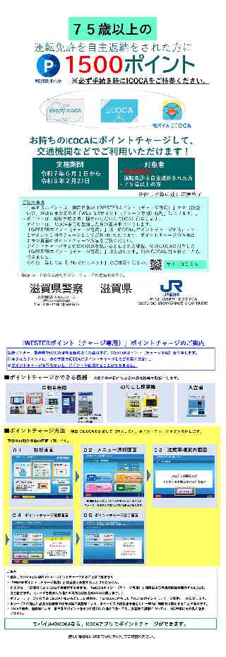 西日本旅客鉄道株式会社(以下、「JR西日本」という。)と滋賀県は、運転に不安を感じる高齢ドライバーの運転免許証返納をサポートすることを目的に、2024年9月〜2025年2月の期間で運転免許証を返納された75歳以上の方に対して、お手持ちのICOCAにチャージしてご利用いただけるWESTERポイント(チャージ専用)を1,500ポイント進呈する事業を実施いたしましたが、ご好評につき2025年度についても継続することに合意しました。今後もJR西日本と滋賀県は、更なる連携を図り、デジタル技術を取り入れた持続可能な地域づくりに取り組んでまいります。