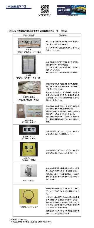 東海旅客鉄道株式会社 JR東海鉄道倶楽部で在来線鉄道用品をオークション形式で販売します! 〜参宮線の臨時駅(廃駅)「池の浦シーサイド」駅の駅名標も登場〜 JR東海のECサイト「JR東海MARKET」にて、JR東海直営ショップ「JR東海鉄道倶楽部」から、当社在来線鉄道用品を出品し、オークション形式で販売いたします。今回のオークションでは、2020年3月に廃止された参宮線の臨時駅「池の浦シーサイド」駅の駅名標をはじめとした貴重なアイテムを揃えています。 オークション形式による在来線鉄道用品の販売は、JR東海として初めてとなります。 1.オークション概要 実施期間:2025年6月9日(月)15:00〜6月19日(木)23:59 ※オークション終了10分前から終了までに入札があった場合、 入札可能時間が10分ずつ延長となります。 販売場所:JR東海MARKET オークションページ (https://market.jr-central.co.jp/shop/auction/list.aspx) 販売方式:オークション形式(入札制) 支払方法:クレジットカード 引渡方法:配送 2.販売予定商品 駅名標(池の浦シーサイド駅)、豊橋駅連動図表(豊橋駅)、建物資産標(半田駅)等、在来線用品全8点。 ※詳細は別紙にてご確認ください。 3.注意事項 ・サイズ・送料等の詳細は各商品ページをご確認いただき、ご了承の上で入札・購入をお願いします。 ・オークションご利用にあたっては、各商品ページの注意事項のほか「オークションご利用ガイド」および「オークションのQ&A」も併せて確認ください。 ・商品は実際に使用されていたものであるため、傷や汚れがある場合がございます。 また、動作保証・品質保証はいたしかねます。 ・怪我防止等の加工は行わず、取り外したままの状態でお渡しします。 そのため、取扱時の怪我等にはご留意ください。 |