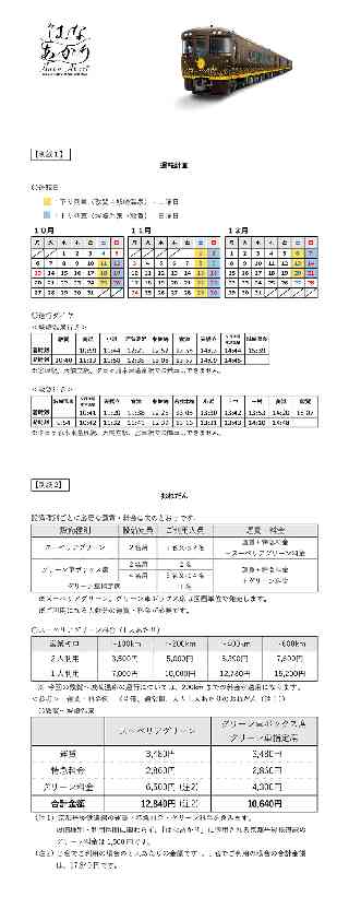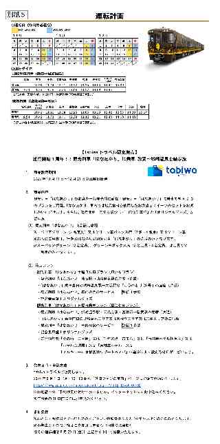 JR西日本グループ Release もっとつながる。未来が動き出す 2025年 7月17日 西日本旅客鉄道株式会社 祝・運行開始1周年!! 観光列車「はなあかり」 2025年秋 敦賀〜城崎温泉間運行!! 観光列車「はなあかり」の2025年秋季の運転計画が決まりましたのでお知らせいたします。 この秋は「北陸デスティネーションキャンペーン アフターキャンペーン」に合わせて敦賀〜城崎温泉間で運行します。「地域の華を列車に集め、お客様と地域の縁を結ぶ列車」をコンセプトに、エリアを変えながら西日本各地を運行するこの列車で、ゆったりとした贅沢な旅をお楽しみください。 1.運転計画 【別紙1】 (1)運転開始日 2025年10月11日(土) (2)運転区間 敦賀〜城崎温泉 (小浜線、舞鶴線、京都丹後鉄道 宮津線・宮豊線、山陰本線経由) (3)運転期間 2025年10月11日(土)〜12月21日(日)の間の土日 【各日片道運行】 全22日・22本 2.おねだん 【別紙2】 運賃・料金例 (片道、通常期、大人1人あたりのおねだん) ┌────────────┬───────┐ │ │敦賀〜城崎温泉│ ├────────────┼───────┤ │スーペリアグリーン(注)│ 12,840円 │ ├────────────┼───────┤ │ グリーン車指定席 │ 10,640円 │ └────────────┴───────┘ (注)2名でご利用の場合 3.きっぷの発売箇所 ・全国の駅のみどりの窓口および主な旅行会社窓口 ・JR西日本インターネット予約「e5489」 ※グリーン車指定席は、JR西日本インターネット予約「e5489」の「観光列車チケットレス」も設定します。窓口に並ぶことなくお手元のモバイル端末で「特急券」の購入が可能で、きっぷの受取をせずスムーズにご利用いただけます。運賃部分は別途必要です。 グリーン車ボックス席(2名用・4名用)およびスーペリアグリーン車の設定はございません。 ・2025年9月11日(木)10:00から発売開始します。 ※グリーン車指定席は、「e5489」の事前申込サービスをご利用いただけます。 4.おもてなし (1)食のサービス 地元ならではの食材を使用した食のサービスを、事前予約限定で販売する予定です。詳細は改めてお知らせいたします。 (2)駅や車内でのおもてなし アテンダント3名が乗車し、地域ならではのお土産品や飲料、「はなあかり」グッズを販売します。 駅でのお出迎えや車内での地産品の販売などお客様と地域を結ぶふれあいの場を一部日程でご用意します。詳細は改めてお知らせいたします。 5.車内の調度品 スーペリアグリーン車飾り棚の調度品を福井県・京都府など沿線の工芸品・アート作品に入れ替えます。詳細は改めてお知らせいたします。 6.特別な旅行商品 一部、「tabiwaトラベル」で旅行商品を販売する予定です。きっぷの通常販売に先行してお求めいただけます。詳細は改めてご案内いたします。 観光列車「はなあかり」に関する詳細は、「はなあかり」特設サイトでご案内いたします。 https://www.jr-odekake.net/railroad/hanaakari/ <参考>北陸デスティネーションキャンペーン アフターキャンペーン 開催期間:2025年10月1日(水)〜2025年12月31日(水) ※詳細は別途、プレス発表にてお知らせいたします。 |