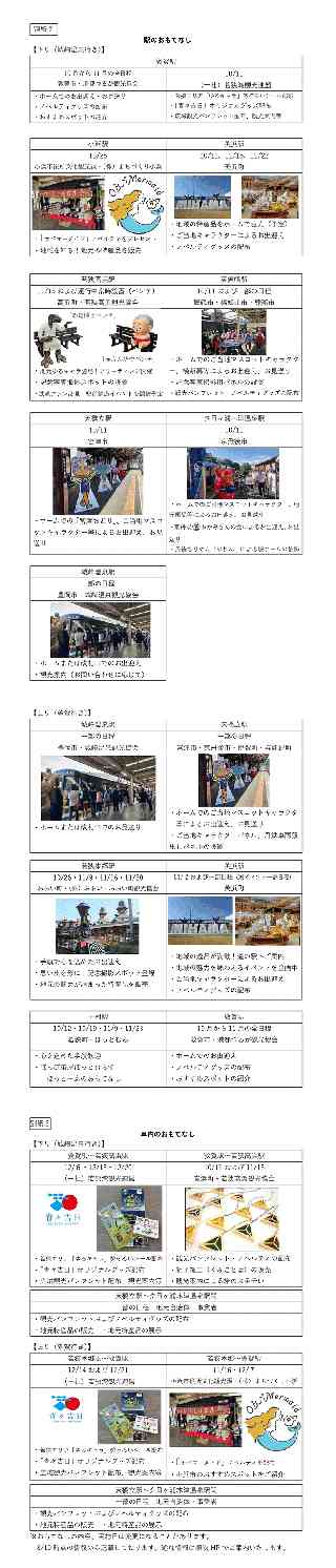 JR西日本グループ Release もっとつながる。未来が動き出す 2025年 8月19日 西日本旅客鉄道株式会社 祝・運行開始 1周年!!観光列車「はなあかり」 2025年秋敦賀〜城崎温泉間運行!! 〜駅や車内でのおもてなし・特別な旅行商品〜 観光列車「はなあかり」は、2025年秋季は「北陸デスティネーションキャンペーンアフターキャンペーン」に合わせて敦賀から城崎温泉間で運行します。このたび、一部の日程で実施する駅および車内でのおもてなし、ならびに車内で展示する調度品の詳細が決まりましたのでお知らせします。 また「はなあかり」と宿泊などがセットになった特別な旅行商品も販売します。 兵庫・京都・北陸エリアへのご旅行にぜひご利用ください。 1.駅や車内でのおもてなし (1)食のサービス [別紙1] 地元ならではの食材を使用した食のサービスを、事前予約限定で販売します。 (2)駅でのおもてなし [別紙2] 一部の日程・停車駅で、地産品の販売・地元のご当地キャラクターや地元関係者によ るお出迎え・ご案内等を実施します。 (3)「はなあかり」車内でのおもてなし [別紙3] 一部の日程・区間で地元の方々による地産品の紹介や販売を行います。 また車内にアテンダントが3名乗車し、沿線ならではのお土産品や飲料、「はなあかり」グッズを販売します。 ※今後おもてなし内容について追加等の変更が発生した場合は、決定次第、観光列車「はなあかり」特設サイト上でお知らせします。 2.車内の調度品 [別紙4] 運行期間中、1号車(スーペリアグリーン車)の飾り棚などに福井県・京都府・兵庫県の工芸品・アート作品を展示します。 3.運転計画 [別紙5] (1)運転区間 敦賀〜城崎温泉 (小浜線、舞鶴線、京都丹後鉄道 宮舞線・宮豊線、山陰本線経由) (2)運転期間 2025年10月11日(土)〜12月21日(日)の間の土日【各日片道運行】 全22日・22本 4.発売方法 ・全国の駅のみどりの窓口および主な旅行会社窓口 ・JR西日本インターネット予約「e5489」 ※2025年9月11日(木)10:00から発売開始します。 ※グリーン車指定席は、「e5489」の事前申し込みサービスをご利用いただけます。 5.特別な旅行商品 [別紙6] 「はなあかり」への乗車と車内での食事、ホテルや旅館の宿泊などがセットになった特別な旅行商品を「tabiwaトラベル」で販売します。 ※2025年9月1日(月)13:00から販売開始します。 |