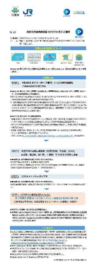 兵 庫 県 丹 波 市 西日本旅客鉄道株式会社 「丹波市鉄道利用増進 WESTERポイント事業」の継続について <2025年4月1日〜2026年3月31日> 兵庫県丹波市と西日本旅客鉄道株式会社(以下、 JR西日本)が連携し、2021年7月に開始した「丹波市鉄道利用増進 WESTERポイント事業(※)」につきまして、好評につき 2025年4月以降も継続して実施いたします。 ※自治体がICOCA ポイントを還元する事業として、 JR西日本管内で初めて開始 1.実施期間 2025年4月1日(火)〜2026年3月31日(火)まで 2.実施概要 期間中に、丹波市内の福知山線各駅(丹波竹田駅、市島駅、黒井駅、石生駅、柏原駅、谷川駅、下滝駅)からICOCAを利用して鉄道に乗車し、ICOCAエリア内の駅で下車した方を対象に、後日、ご利用1回ごとにJRご利用分(運賃)の5%相当(1ポイント未満の端数は切り捨て)を WESTERポイント(チャージ専用)で還元します。 3.ご利用条件 ご利用当日までに WESTERポイント(チャージ専用)サービスの利用登録(無料)の完了が必要です。 ※利用登録完了の当日のご利用分から本事業の対象となります。 ※モバイルICOCA / Apple Payの ICOCA、SMART ICOCAは利用登録不要です (発行時に自動で利用登録されます)。 ※WESTERポイント(チャージ専用)はご利用日の翌月中に還元します。 ※たまったポイントは、自動券売機などで ICOCAにチャージしていただき、列車のご利用やお買い物などにご利用いただけます(モバイルICOCA / Apple PayのICOCAの場合、ICOCAアプリのご利用により、お持ちのスマートフォンでポイントチャージいただけます)。 ※その他、詳しい条件や注意事項については、別紙をご覧ください。 4.その他 ・丹波市鉄道利用増進 WESTERポイント事業の詳細は、丹波市ホームページ丹波市鉄道利用増進WESTERポイント事業のお知らせ/丹波市ホームページ(tamba.lg.jp)をご参照ください。 |