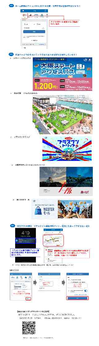 JR西日本グループ Release もっとつながる。未来が動き出す 2025年 4月 7日 西日本旅客鉄道株式会社 WESTERアプリで2025年大阪・関西万博の「おトク」・「便利」がてのひらに! 〜チケット情報や運行情報を集約した特設ページをオープン、リアルタイムな運行情報の提供がさらにパワーアップしました〜 西日本旅客鉄道株式会社(本社:大阪市北区、社長:長谷川一明)が提供する移動生活アプリ『WESTER』は、2025年4月7日(月)のアップデートにより、ホーム画面に2025年大阪・関西万博の特設ページをオープンし、おトクなチケット情報や運行情報を一目で確認できる新機能を搭載しました。 また、リアルタイム運行情報プッシュ通知のJR西日本の全路線への拡大、運行情報の確認画面に遅延等の運行情報を反映した路線図を追加し、よりわかりやすく運行情報の「今」を把握することができるようになりました。 NEWs ホーム画面のアイコンから2025年大阪・関西万博の情報が確認できる! 今回新たに搭載されたアイコンをタップすることで、特設ページに直接アクセスができます。特設ページ内のコンテンツは随時更新してまいりますので、2025年大阪・関西万博を訪れる際のおトクで便利な情報をリアルタイムで把握することで、万博体験がより充実したものになります。今すぐWESTERアプリをダウンロードして、2025年大阪・関西万博を手のひらに! NEWs 特設ページ内の各コンテンツではさまざまな情報を提供しています! 特設ページ内では、2025年大阪・関西万博にまつわるさまざまなコンテンツを掲載していますが、ここからは特設ページからアクセスできるコンテンツの一部をご紹介いたします。 ▼スマートアクセスパス 大阪スマートアクセスパスは、「KANSAI MaaS」限定で発売されているOsaka MetroとJR西日本の路線を1日乗り放題で利用できるデジタル乗車券です。Osaka Metroの地下鉄・ニュートラム全線(「いまざとライナー」は除く)や、JR大阪環状線、JRゆめ咲線(桜島線)全線、新大阪駅、JR難波駅が含まれ、関西圏の移動がスムーズになります。 ▼弁天町駅 (べんてんひろば) 2025年大阪・関西万博の開催を機に、万博会場への乗換結節駅となる大阪環状線、JR弁天町駅前にあつまる、つながる“スペース「べんてんひろば」がオープンします。万博期間中はイベントスペースとして、駅周辺のにぎわい創出にチャレンジします。 ▼プラスワントリップ 「せっかく万博に来たなら」をキーワードに、万博エリアからちょこっと・ぐいっと足を伸ばしてあなただけの「プラスワン」を楽しんでみませんか!?.西日本各地のイベント情報やおすすめスポット、万博期間限定のおトクな旅行商品やキャンペーンをご紹介しています。 ▼大阪デスティネーションキャンペーン JRグループ6社と自治体及び観光関係団体が一体となって取り組む大型観光プロモーション「デスティネーションキャンペーン」。「来てな!オモロイがいっぱい大阪旅」をキャッチフレーズに、.有名スポットの知られていない..や、大阪のまだ見たことのない新しさを感じるスポットなど大阪の魅力を紹介します。 ▼WESTERモール 西日本のお土産や食品、ギフト商品などを販売しており、旅と買い物に関わる商品を取り揃えています。またWESTERポイントがつかえ、ECのお買い物でポイントがたまり、“おトクに”楽しくお買いが体験できます。混雑時に並ばず・手ぶらでのお土産購入を是非お楽しみください。 ▼シャトルバス予約 万博会場−近隣の主要駅間等で運行されるバス(駅シャトルバス)の全ルート及び空港直行バスの乗車券の購入が可能です。なお、ご購入の際は、「KANSAI MaaS」から予約・決済をすることができます。 NEWs WESTERの機能「リアルタイム遅延情報プッシュ通知」対象エリアがさらに拡大 WESTERアプリで搭載している「運行情報プッシュ」機能では、利用頻度の高い駅や路線を「マイ駅」として登録し、運行情報の受け取りを許諾することで、遅延や運転見合わせが発生した際は自動で通知を受け取ることができます。現在JR京都線とJR神戸線でのみのサービス提供でしたが、今般、JR西日本の全路線でのサービスを開始します。また、一部路線において運行情報確認画面に路線図を追加することで、ご利用エリアの遅延等の状況をよりわかりやすく一目で把握することが可能となりました。 2025年大阪・関西万博では関西圏以外の方の参加も多く見込まれるため、大変な混雑が予測されます。来場予定の方は、ご自身がよく使う駅を事前に「マイ駅」に登録し、運行情報プッシュ通知を受け取る設定をしておきましょう! 今すぐWESTERアプリをダウンロードして、2025年大阪・関西万博をさらにおトクに便利に楽しみましょう! 【WESTERアプリダウンロードのご案内】 以下のQRコードよりアクセスいただき、ぜひご利用ください。 (WESTERアプリ 動作環境 iPhone:iOS 15.0以上、Android:OS 9.0以上) *伊藤注:添付画像をご利用下さい。 |