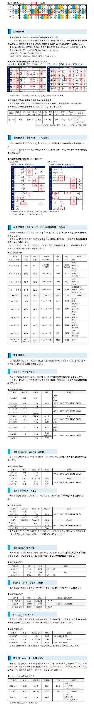 JR西日本グループ Release もっとつながる。未来が動き出す 2025年 5月16日 西日本旅客鉄道株式会社 2025年【 夏 】の臨時列車の運転について 【 2025年7月1日(火)〜 2025年9月30日(火):92日間 】 JR西日本では、お盆期間を中心に山陽新幹線2,039本、北陸新幹線1,032本、在来線特急1,049本の臨時列車を運転します。西日本各方面へのおでかけ、大阪・関西万博へお越しの際には、新幹線・在来線特急をぜひご利用ください。 1. 列車運転本数 ┌─────┬───────┬──────┬───────┬──────┐ │ │ 夏期間 │うち定期列車│ お盆期間 │うち定期列車│ │ │(定期+臨時)│ │(定期+臨時)│ │ ├─────┼───────┼──────┼───────┼──────┤ │山陽新幹線│ 272本/日 │ 250本/日 │ 323本/日 │ 248本/日 │ ├─────┼───────┼──────┼───────┼──────┤ │北陸新幹線│ 116本/日 │ 105本/日 │ 136本/日 │ 105本/日 │ ├─────┼───────┼──────┼───────┼──────┤ │在来線特急│ 408本/日 │ 397本/日 │ 425本/日 │ 396本/日 │ └─────┴───────┴──────┴───────┴──────┘ 【参考】夏期間のカレンダー *伊藤注:添付画像をご参照下さい。 2. 指定席の発売について 各列車、運転日の1か月前の午前10時から発売します。 JR西日本では、便利でおトクなネット予約サービスをご用意しています。 ■ 東海道・山陽・九州新幹線のご利用におすすめ 東海道・山陽・九州新幹線ネット予約&チケットレス乗車サービス ※「EXサービス」では、最大1年先まで指定席の予約が可能です。 ■ 北陸新幹線、在来線特急、有料座席サービスのご利用におすすめ JR西日本ネット予約「e5489」 詳しくは、https://www.jr-odekake.net/goyoyaku/でご確認ください。 詳しい運転日・時刻・停車駅は、マイ・ダイヤにてご案内いたします。 https://www.jr-odekake.net/ |