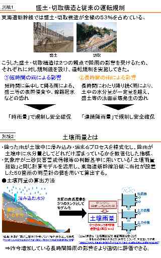 東海旅客鉄道株式会社 東海道新幹線における新しい降雨運転規制について 東海道新幹線では、沿線に設置した雨量計を用いて、降雨量が規制値に達した場合に徐行や運転見合わせなどの運転規制を実施し、安全を確保してきました。 このたび、昨今の降雨の状況や過去の雨量データ等を基にした検討結果を踏まえ、一層の安全確保を目的に、長時間雨量の評価指標として「土壌雨量」を導入するとともに、規制値は過去の経験雨量等を基に雨量計ごとに設定することで、よりきめ細やかな運転規制を行います。 1.従来の運転規制(別紙1) 時雨量・連続降雨量※1・10分間雨量を用いてきました。※2 ・運転見合わせの規制値 ┌───┬─────┬────────────┬─────────────┐ │ │ 時雨量 │ 連続降雨量 *1+時雨量 │連続降雨量 *1+10分間雨量 │ ├───┼─────┼────────────┼─────────────┤ │規制値│60mm以上│150o以上+40mm以上│ 300mm以上+2mm以上 │ └───┴─────┴────────────┴─────────────┘ ※1 過去24時間あたりの降雨量 ※2 土石流により運行に影響を及ぼす恐れのある2箇所については「土壌雨量指数」も用いています。「土壌雨量指数」とは、気象庁が土砂災害警戒情報等の判断基準に用いている指標です。 2.新しい運転規制 長時間の雨による影響の指標として、連続降雨量に代えて「土壌雨量」を導入します。 「土壌雨量」は、気象庁が用いている土壌雨量指数と同じ計算モデルを活用しつつ、沿線に設置した当社の雨量計(59箇所)の値を用いて算出する指標です。(別紙2) ・運転見合わせの規制値 ┌───┬─────┬────────────────────────┐ │ │ 時雨量 │ 土壌雨量 │ ├───┼─────┼────────────────────────┤ │規制値│60mm以上│過去の経験雨量等を基に雨量計ごとに設定した数値 │ └───┴─────┴────────────────────────┘ ・新しい運転規制の効果 @長時間降雨の影響をより適切に評価 これまで用いてきた連続降雨量に比べ、「土壌雨量」は降り始めからの降雨の影響をより長時間にわたって正確に反映することが出来ます。これにより、昨今増加している24時間以上にわたって強く降り続く雨が設備に与える影響を、より適切に評価することが出来ます。 Aよりきめ細やかな運転規制の実施 従来は全線で一律の規制値を用いていましたが、今回の「土壌雨量」では、地形や過去の経験雨量等に照らして雨量計ごとに規制値を設定します。これにより、よりきめ細やかな運転規制を行うことが出来ます。 3.開始時期 2025年6月1日 4.今後の取組み 現在進めている降雨時の線路設備のモニタリング(2024年5月22日リリース)の結果等に基づき、今後、必要に応じて設備の強化を行いつつ、土壌雨量の規制値を見直していくことで、東海道新幹線の更なる安全・安定輸送に繋げていきます。 盛土・切取構造と従来の運転規制 |