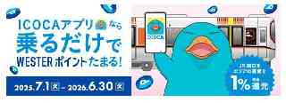 JR西日本グループ Release もっとつながる。未来が動き出す 2025年 6月19日 西日本旅客鉄道株式会社 「ICOCAアプリなら乗るだけでWESTERポイントたまる!」 キャンペーンを開始します! 西日本旅客鉄道株式会社(本社:大阪市北区、社長:倉坂昇治、以下 JR西日本)では、2025年7月1日(火)から2026年6月30日(火)までの間に、ICOCAアプリでJR西日本の鉄道に乗車されるとWESTERポイントがたまるキャンペーンを開始します。 便利なICOCAアプリをつかって、おトクにポイントをためよう! 1. 実施期間 2025年7月1日(火)から2026年6月30日(火) ※本キャンペーンへの参加にエントリーは不要です。 2. ポイント付与条件 ICOCAアプリでのJR西日本のICOCAエリア内の駅相互間の利用が対象です。 ※ JR西日本以外の鉄道を含むご利用は対象外です。このほか、一部対象外となる場合があります。詳細は、特設ページをご確認ください。 ※ ウォレットアプリのみのご利用は対象外です。 3. ポイントの種類と付与率 ●付与されるポイントはWESTERポイント(基本)です。 ●1カ月間(1日から末日まで)にICOCAアプリでご利用いただいた運賃の1%を翌月末以降に付与します。 4. その他 ●キャンペーンの詳細は、以下の特設ページをご確認ください。 https://www.jr-odekake.net/icoca/mobile/train-point/ ●たまったWESTERポイントでおトクに鉄道が乗れます。詳細は、以下の特設ページをご確認ください。 https://www.jr-odekake.net/navi/westerpoint_tetsudouriyou_gentei/ ●たまったWESTERポイントはルクア大阪などのショッピングセンター、エキマルシェなどの駅ナカ・駅チカ店舗のほか、旅行・レンタカー・高速バスなどでも便利にご利用可能です。詳細は、以下のページをご確認ください。 https://wester.jr-odekake.net/point/store-use/#tab2 ※「ICOCA」「モバイル ICOCA」は西日本旅客鉄道株式会社の登録商標です。 ※ Apple Pay は Apple Inc.の登録商標です。 |