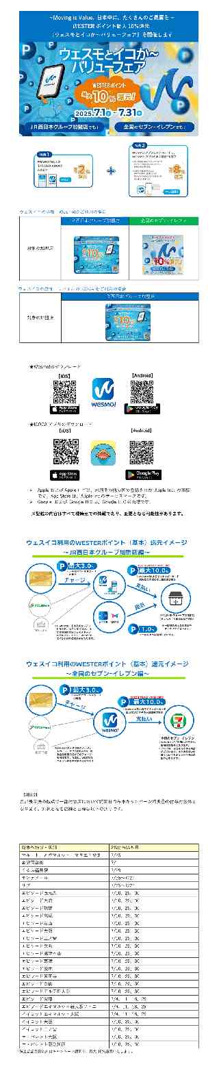 JR西日本グループ Release もっとつながる。未来が動き出す 2025年 6月23日 西日本旅客鉄道株式会社 〜Moving is Value. 日本中に、たくさんのご贔屓を〜 WESTERポイント最大10%還元 『ウェスモとイコか〜バリューフェア』を開催します 西日本旅客鉄道株式会社(本社:大阪府大阪市、代表取締役社長:倉坂昇治)は、2025年5月28日にリリースしましたJR西日本のスマホ決済アプリ『Wesmo!』のキャンペーンとしまして、Wesmo!やモバイルのICOCA(WESTER会員登録しているモバイルICOCA/Apple PayのICOCA。以下同)のご利用でWESTERポイント(基本)最大10%還元とおトクになる『ウェスモとイコか〜バリューフェア』(通称:ウェスイコ)を2025年7月1日(火)〜7月31日(木)まで開催します。 Wesmo!のご利用ではJR西日本グループ加盟店や全国のセブン-イレブン店舗が対象に、モバイルのICOCAのご利用はJR西日本グループ加盟店が対象となります。 この機会にぜひWesmo!をダウンロードのうえ、Wesmo!やモバイルのICOCAでお買い物をしていただき、『ウェスイコ』に奮ってご参加ください。 ※本キャンペーンでたまるWESTERポイントについては【別紙1】をご確認ください。 NEWS ウェスイコの概要 開催期間 2025年7月1日〜7月31日 決済手段(お支払い方法) ・Wesmo!のご利用 ・モバイルのICOCAのご利用 (JR西日本グループ加盟店のみ対象) 対象店舗 ・JR西日本グループ加盟店 ・全国のセブン-イレブン店舗 ※セブン-イレブンはWesmo!のご利用分のみキャンペーン対象 特 典 @ 最大2%還元 Wesmo!またはモバイルのICOCAご利用で最大2%還元 A 最大8%還元 Wesmo!をダウンロードのうえ、Wesmo!でマイナンバーカードICチップ読み取り方式での本人確認を完了すれば、さらに最大8%還元 キャンペーンポイント還元時期 2025年9月下旬(予定) 備 考 ・キャンペーン開始前にWesmo!のダウンロードおよびマイナンバーカードICチップ読み取り方式での本人確認を完了していただいている方も対象となります。 ・WESTERポイントの還元時期については通常ポイントとキャンペーンポイントで異なります。 ・Wesmo!とモバイルのICOCAにおいてもWESTERポイントの還元時期が異なります。 ・ご利用総額に対して付与する還元ポイントの小数点以下は切り捨ていたします。 ・特典の諸条件や注意事項については後述の「キャンペーン詳細」ならびにキャンペーンページ、FAQをご確認ください。 NEWS ウェスイコの詳細 <キャンペーン詳細> お支払い方法 Wesmo! 対象の加盟店 JR西日本グループ加盟店 全国のセブン-イレブン WESTERポイント(基本)最大2%還元 最大2%適用条件 ・Wesmo!のご利用 さらに最大8%還元 最大8%適用条件 ・Wesmo!におけるマイナンバーカードICチップ読み取り方式による本人確認完了(2025年7月31日時点で完了していること) ※キャンペーン開始前に完了いただいている方も対象です。 備 考 ・JR西日本グループ加盟店は上記POP等広告宣伝物が掲出された店舗に限ります。 ・セブン-イレブンは全国の店舗がキャンペーンの対象となりますが、Wesmo!がご利用いただけない一部店舗は本キャンペーンの対象外となります。なおセブン-イレブンでは「Smart Code(TM)」としてのご利用になります。 ・WESTERポイントでお支払いしたものはご利用総額には含まれません。 ・タバコの購入分等、本キャンペーンの対象外となる商品・サービスがございます。 ・キャンペーンのポイント還元は2025年9月下旬を予定しています。 ・JR西日本のグループ店舗のうち、一部対象店の特定日のご利用については景品表示法に則り、特典Aの対象外となります。該当する店舗ならびに日付については【別紙2】をご確認ください。 NEWS ウェスイコの詳細 モバイルのICOCAをご利用の場合 <キャンペーン詳細> お支払い方法 モバイルのICOCA 対象の加盟店 JR西日本グループ加盟店 WESTERポイント(基本) 最大2%還元 最大2%適用条件 ・モバイルのICOCAのご利用 さらに最大8%還元 最大8%適用条件 ・Wesmo!のダウンロード ・ICOCAアプリと同一のWESTER IDでWesmo!にログインのうえ、マイナンバーカードICチップ読み取り方式による本人確認完了(2025年7月31日時点で完了していること) ※キャンペーン開始前に完了いただいている方も対象です。 備 考 ・対象は上記POP等広告宣伝物が掲出された店舗に限ります。 ・モバイルのICOCAのWESTER IDはダウンロードしたWesmo!と同一のものである場合に限ります。 ・特典の対象はモバイルのICOCAのご利用に限ります(※) ・一部、本キャンペーンの対象外となる商品・サービスがございます。 ・キャンペーンのポイント還元は2025年9月下旬を予定しています。 ・一部の対象店の特定日のご利用については景品表示法に則り、特典Aの対象外となります。該当する店舗ならびに日付については【別紙2】をご確認ください。 ※ウォレットアプリのみをご利用で、一度もICOCAアプリにログインしていないApple PayのICOCAやカードタイプのICOCAは対象外となります。 本プレスに関する詳細・よくある質問は以下をご確認ください。 ★Wesmo!サービス全般について https://wester.jr-odekake.net/wesmo/ ★ウ