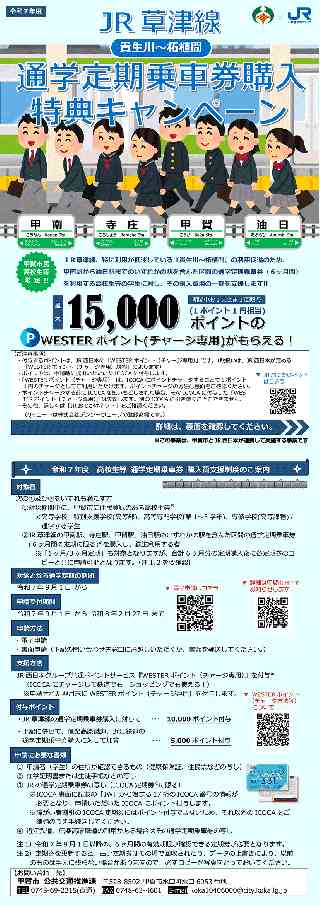 滋賀県甲賀市と西日本旅客鉄道株式会社(以下、「JR西日本」という。)は、JR草津線(貴生川〜柘植間)の利用促進を目的に、その区間を含む通学定期乗車券をご利用の高校生等の学生の方に対して、お手持ちのICOCAにチャージしてご利用いただけるWESTERポイント(チャージ専用)を最大15,000ポイント進呈する事業を実施いたします。