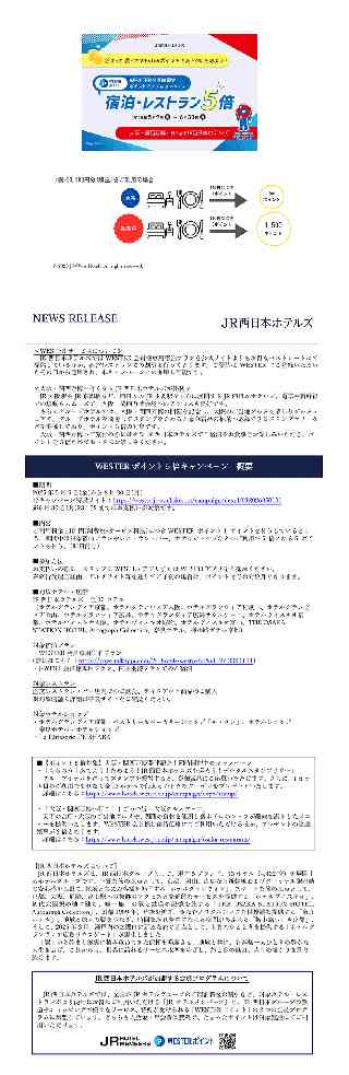 株式会社ジェイアール西日本ホテル開発 泊まって、食べて、おトクにポイントGET WESTERポイント5倍キャンペーン 〜大阪・関西万博へ行くならJR西日本ホテルズが便利!〜 株式会社ジェイアール西日本ホテル開発(京都府京都市下京区、代表取締役社長 伊勢正文)は、JR西日本ホテルズ全13ホテルにて、WESTERポイントの付与が通常の5倍になる「WESTERポイント5倍キャンペーン」を、2025年5月9日(金)から6月30日(月)まで実施します。 大阪・関西万博がいよいよ開幕し、大阪をはじめとした関西エリアへのお出かけの機会も増えてまいりました。西日本のJR主要駅を中心に展開するJR西日本ホテルズは、大阪・関西万博の会場である夢洲へのアクセスはもちろん、新緑の京都や奈良などの観光スポットへのご移動もスムーズです。西日本エリアへのご旅行やお出かけの際には、ぜひJR西日本ホテルズで、泊まって、食べて、おトクにポイントをためてお楽しみください。 ◇キャンペーン特設ページ: https://wester.jr-odekake.net/campaign/detail/012026050101 対象宿泊プランやレストラン・バー、ホテルショップなどのご利用料金110円(消費税・サービス料込)につき、WESTERポイント1ポイントを付与しているところ、期間中は特別に5倍となる5ポイントを付与いたします(エントリー不要)。 本キャンペーンでたまったポイントは、次回以降にJR西日本グループの各種サービスにてご利用いただけます。 |