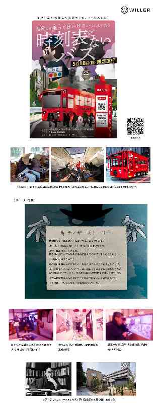 <NEWS RELEASE> WILLER株式会社 電気バス「IKEBUS」に乗り、池袋の都市伝説を解明するアトラクション 『時刻表にないバス』を5月18日(日)に開催 ―江戸川乱歩が住んだまち・池袋で没入型ミステリー体験を楽しむイベントですー WILLER(代表:村P 茂高)は、一般社団法人としまアートカルチャーまちづくり協議会(所在地:東京都豊島区、代表理事:前田 三郎)と連携し、豊島区協力のもと2025年5月18日(日)に電気バス「IKEBUS」を活用した体験型ミステリーバスイベント『時刻表にないバス』(https://mysterytown.jp/ikebus_ranpofes_teaser-site/)を開催します。 本イベントは、5月15日(木)から開催される旧江戸川乱歩邸リニューアルオープン記念“としま乱歩フェス”とのコラボレーションで実現しました。参加者は「IKEBUS」に乗車し、池袋の様々な場所で調査を行い、都市伝説の真相に迫る体験型アトラクションです。 ■『時刻表にはないバス』で連れ去られ、池袋の都市伝説の真相に迫る 参加者は池袋の都市伝説を調査している新聞記者になりきり、『時刻表にはないバス』に乗り込みます。「IKEBUS」に乗車すると、袋を被せられおかしな世界に連れ去られてしまう一行。都市伝説の真相を解明するため「IKEBUS」の車中や、池袋の様々な場所で、調査を行っていくアトラクションです。 開催日時:2025年 5月18日(日) 1回目… 9:15集合・ 9:30発 2回目…12:45集合・13:00発 参加費:2,800円/1人 所要時間:約2時間 申込方法:特設サイト(https://mysterytown.jp/ikebus_ranpofes_teaser-site/)にてご予約ください。 【ストーリー概要】 *伊藤注:添付画像をご覧下さい。 ■消滅可能性都市を脱却した豊島区の、さらなる魅力を発見。誰もが主役になれる体験型イベントを 2014年に東京23区で唯一消滅可能性都市と指摘された豊島区ですが、2015年に国際アート・カルチャー都市構想をかかげ、「まち全体が舞台の誰もが主役になれる劇場都市」として、様々な都市のイメージ向上、居住者・来街者の増加、地域経済の活性化につながる施策を行ってきました。池袋をめぐる真っ赤な電気バス、「IKEBUS」もそのひとつです。区内22法人企業が「IKEBUS」サポーターとなり、公民連携で運行してきました。2024年に消滅可能性都市を脱却した豊島区ですが、さらなる魅力を発見できる「IKEBUS」ツアーを企画しました。池袋は、旧江戸川乱歩邸が現存しておりミステリーに縁が深い地域です。今回は旧江戸川乱歩邸リニューアルオープン記念“としま乱歩フェス”とのコラボで、ミステリーツアーが実現しました。 <豊島区 都市整備部 地域公共交通担当課長 河野敬輝氏からのコメント> IKEBUSは、池袋をゆっくりめぐり、見過ごしがちな景色や魅力スポット、隠れスポットを再発見できる、真っ赤なかわいい電気バスです。今回のミステリーでは“新聞記者”になりきり、都市伝説を解明しながら物語を体験することで、これまで知らなかった池袋の一面を発見できます。ぜひみなさん体験してください。 ■「IKEBUS」概要 【乗車定員】22名(乗務員込み) 【最高速度】時速19Km 【サイズ】全長5,165o、全幅2,105o、全高2,710o 【デザイン】株式会社ドーンデザイン研究所/水戸岡鋭治氏 【車両制作】株式会社シンクトゥギャザー 【運行会社】WILLER EXPESS株式会社 【貸切運行】一般社団法人としまアートカルチャーまちづくり協議会へ要予約 (電話:03-3983-2366) ※走行ルートは要相談 【運賃】 ・1回乗車:おとな200円、こども(小学生以上)・高齢者・障がい者100円 ・お得なフリーパス「1日乗車券」:おとな500円、こども(小学生以上)・高齢者・障がい者250円 ・回数券(100円券×11枚つづり):1,000円 ※小学生未満のお子さまは無料です。 ※詳細は「IKEBUS」サイトをご覧ください。 【IKEBUSサイト】https://travel.willer.co.jp/ikebus/ (運行ルートや時刻表をご確認いただけます。) 【IKEBUS公式X】https://twitter.com/IKEBUS1127 【IKEBUS公式Instagram】https://www.instagram.com/ikebus_1127/ |