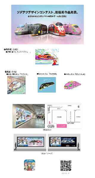 株式会社JR西日本コミュニケーションズ 株式会社JR西日本イノベーションズ 株式会社ジェイコンテンツ 鉄道ゲーム『ソダテツ』車両デザインコンテスト受賞作が “動く大型ポスター”に─ 5月19日からJR大阪駅で公開 〜角度で絵柄が切り替わるプリンテッドXR(R)ポスターで受賞作品を発表! ゲームで使えるオリジナル車両も配布決定!〜 JR西日本グループが企画し、株式会社ジェイコンテンツが開発・運営する鉄道育成ゲームアプリ『ソダテツ』は、全国のプレイヤーから募集した「オリジナル車両デザインコンテスト」の受賞作品4点を、2025年5月19日(月)から、大阪駅桜橋口の地下通路において大型ポスターとして掲出します。 今回のポスターには、視点の角度によって絵柄が切り替わる特殊印刷技術「プリンテッドXR(R)」を採用しており、異なる車両が交互に現れる“動く鉄道アート”として、通勤・通学で駅をご利用の皆さまや鉄道ファンの皆さまに新たな驚きをお届けします。 さらに、ポスターに掲載されたQRコードを読み取ることで、受賞デザインのオリジナル車両を『ソダテツ』ゲーム内で取得することが可能です。リアルとデジタルが交差する“育てる鉄道”の世界を、ぜひこの機会にご体感ください。 ■ 最優秀賞は「レッドグリマー」!鉄道愛あふれる全4作品が受賞 本コンテストには、学生や親子、クリエイター、鉄道ファンなど、幅広い世代の方から多くの作品が寄せられました。テーマは「ソダテツに登場させたいオリジナル車両」。審査はデザイン性、独創性、そして「乗ってみたい・育ててみたい」と感じられるかどうかを基準に行われました。 ▼受賞作品(全4作) 最優秀賞(1名) ■沢渡 緑さん「レッドグリマー」 車両の説明:赤い輝きを放つ金魚をモチーフにした車両 受賞者コメント:このたびは最優秀賞をいただき、大変光栄です。旅の記憶に残るような、情熱的で優美な電車を目指してデザインしました。金魚をモチーフに、ヒレをイメージしたパンタグラフや 赤く輝く鱗の表現にこだわっています。 みんなでこの世界をもっと盛り上げていきましょう! 優秀賞(3名) ■大松 雅士さん「ソダソク」 車両の説明:東西南北どこへでも季節をもまたぐ速さ! 育つ速さの異名を持つ車両 受賞者コメント:優秀賞を頂きましてありがとうございます。 今回は、車両に現代アートを取り入れ表現しました。 普段から画材、表現方法選ばず、相手が何を求めていて、 その先でどのように公開されるかを考え表現しています。過去作品も是非ご覧ください。(Instagramアカウント:td5125) ■honjohさん「Pentrain」 車両の説明:ペンギンをモデルにした鉄道車両。中の冷房は効きやすいカモ。 ■みかんさん「ぴんくらぶ」 車両の説明:車体の色は眩しいくらいのショッキングピンク色でアクセントの4色はステンドグラスのように光っている。走る姿の残像に後光が光るように見えて、 見た人が幸せになれる列車。 ※掲載にあたり、コメント等の内容を一部調整しています。 ■ 受賞デザインが大阪駅に登場!特殊印刷技術を活用したポスターを期間限定で掲出 2025年5月19日(月)から、大阪駅桜橋口の地下通路において、「ソダテツ」オリジナル車両デザインコンテストの受賞作品4点を紹介する大型ポスターを期間限定で掲出します。 本ポスターには、株式会社SO-KENの特殊印刷技術「プリンテッドXR(R)」(ベローズプリント方式)が採用されており、視点の角度に応じて絵柄が切り替わる“動く鉄道アート”として、リアルな立体感をお楽しみいただけます。 掲出されるのは、受賞作品を3Dビジュアル化したもので、それぞれのデザインが持つ個性や独創性がリアルに再現されています。通勤・通学で駅をご利用の皆さまや鉄道ファンの皆さまに、新たな視覚体験を提供します。 さらに、ポスター内のQRコードからアクセスできる特設ページでは、ゲーム内で使用できる“受賞車両”の配布も実施しています。ご自身の「ソダテツID※」を入力いただくと、アプリ内で受賞作品のオリジナル車両を取得することができます。 ※ソダテツIDとは、「ソダテツ」を起動後、タイトル画面の右上に表示される数字です。 ■掲出期間:2025年5月19日(月)〜6月1日(日)予定 掲出期間は延長される可能性があります。 その場合、公式Xアカウントで告知します。 ■掲出場所:JR大阪駅 桜橋口地下通路 (Osaka Metro 四つ橋線西梅田駅・阪神大阪梅田駅方面) ■掲出内容:最優秀賞・優秀賞 計4作品の3Dビジュアル ゲーム内で使用できる受賞車両の配布QRコード付き ■技術協力:株式会社SO-KEN(特殊印刷「プリンテッドXRR(ベローズプリント)」) [注意事項] ・駅係員への問い合わせはご遠慮ください。 ・写真撮影およびQRコード読み取りの際は周囲の方へのご配慮をお願いいたします。 ・ゲーム内で使用できる受賞車両の配布QRコードをSNS等で拡散する行為はお控えください。 ■ <鉄道育成ゲームアプリ『ソダテツ(SODATETSU)』とは> 『ソダテツ(SODATETSU)』は、鉄道を集めて、育てて、走ら