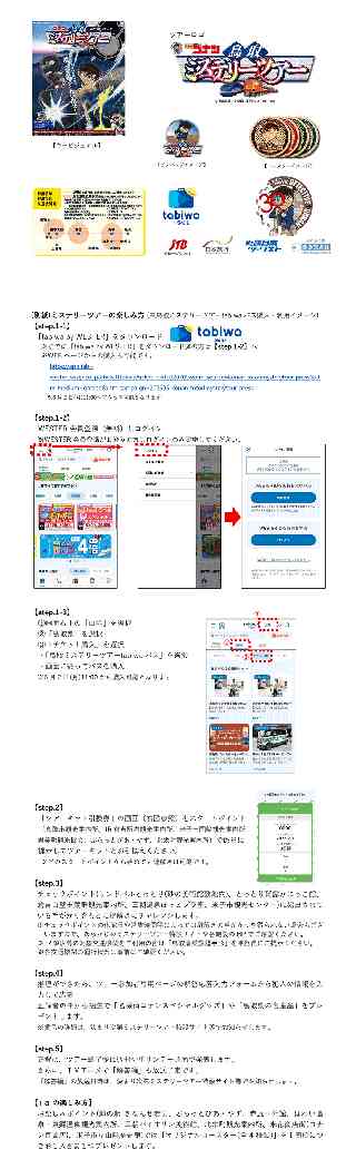 名探偵コナン 鳥取ミステリーツアー実行委員会 「名探偵コナン 鳥取ミステリーツアー 」の概要について 「名探偵コナン 鳥取ミステリーツアー」の開催については2025年3月13日付のニュースリリースでお知らせしましたが、ツアー概要等が決まりましたのでお知らせいたします。 1.ツアー概要 (1) 実施期間 ・2025年7月1日(火)〜2026年1月23日(金) ※設定除外日:2025年12月27日(土)〜2026年1月2日(金) (2) ツアーロゴ *伊藤注:添付画像をご参照下さい。 (3) ツアーの楽しみ方(詳細は別紙参照) 【step.1】 ・ツアーに参加できるツアー専用商品(「鳥取ミステリーツアーtabiwaパス(tabiwa by WESTER専用)」又は「鳥取ミステリーツアーパス(旅行会社専用)」)を購入します。 【step.2】 ・スタートポイント(6箇所のいずれか)でツアー専用商品を提示して「ツアーキット(ツアーブック、オリジナルピンバッジ、鳥取藩乗放題手形)」を手に入れます。 【step.3】 ・ツアーブック(オリジナルストーリー)を読み、チェックポイント(5箇所)を巡り謎解きの手がかりを集め、犯人を推理します。 【step.4】 ・犯人がわかったら、ツアー参加者専用ページから犯人を選び、オリジナルグッズ等がもらえる抽選に応募します。 【step.5】 ・正解は、ツアー終了後に週刊少年サンデー誌面で発表します。 さらに、TVアニメで「解答編」も放送予定です。 ※「解答編」の放送日時は、決まり次第ミステリーツアー特設サイト等でお知らせします。 https://www.conan-tour.jp/ 【+αの楽しみ方】 ・お楽しみポイント(8箇所)では「オリジナルコースター(全4種類)」を1箇所につきお1人さま1つプレゼントします。 2.ツアー専用商品の概要 ツアーに参加するためには以下のツアー専用商品(JR線自由周遊区間、鳥取藩乗放題手形、ツアーキット引換券のセット)を購入いただく必要があります。 (1) 鳥取ミステリーツアーtabiwaパス[tabiwa by WESTER専用] @おねだん ・おとな3,000円、こども2,500円 A発売箇所 ・tabiwa by WESTER ※購入にはWESTER会員登録(無料)が必要です。 ・詳しくは以下の商品ページをご確認ください。 https://app.tabi-wester.westjr.co.jp/eticketDetails?ticket_id=JS020700&utm_source=konan_totorimysterytour_press&utm_medium=qrcode&utm_campaign=202505_konan_totorimysterytour_press ※6月2日(月)11:00〜アクセス可能となります B発売期間 ・2025年6月2日(月)〜2026年1月21日(水) ※ご利用の1か月前から当日まで発売します。 C利用期間 ・2025年7月1日(火)〜2026年1月23日(金) ※設定除外日:2025年12月25日(木)〜2026年1月2日(金)出発分 ※2026年1月21日(水)利用開始分まで発売します。 D有効期間 ・連続する3日間 E効力 ・JR線の自由周遊区間内(山陰本線(東浜〜米子)、因美線(鳥取〜那岐)、伯備線(伯耆大山〜上石見)、境線(米子〜境港))の普通列車(快速含む)の普通車自由席が乗り降り自由です。 ・「鳥取藩乗放題手形」は鳥取・倉吉・米子地区の指定の路線バス(日ノ丸自動車、日本交通)、ループ麒麟獅子バス、若桜鉄道(郡家〜若桜)等が乗り降り自由です。 F旅行プランとおトクなキャンペーン ・tabiwaトラベルでは「鳥取ミステリーツアーtabiwaパス」購入者におすすめの往復JR券と宿泊がセットになった旅行プランを販売します。詳しくは6月2日(月)の「毎月2日は西の日キャンペーン」でご確認ください。 https://www.nta.co.jp/jrodekakenet/nishinohicp/?SITE_ID=66104023 ・「旅は“全部tabiwaで”キャンペーン」を開催中です!鳥取ミステリーツアーtabiwaパスとtabiwaトラベルの旅行プランを一緒に購入すれば、購入金額総額の10%相当のWESTERポイントをプレゼントします。詳しくはキャンペーンページでご確認ください。 https://wester.jr-odekake.net/campaign/detail/012026022601 (2) 鳥取ミステリーツアーパス[旅行会社専用] JR西日本管内の以下の旅行会社では、ツアー開催に合わせて、JRと宿泊と「鳥取ミステリーツアーパス」がセットになった鳥取県への旅行プランを発売します。 詳しくは、出発地周辺の以下の旅行会社へお問い合わせください。 ※「鳥取ミステリーツアーパス」のみの販売はしません。 ※地域によっては旅行プランの設定のない旅行会社もあります。 3.ツアーに合わせた取り組み (1) 出発セレモニー ・日 時:2025年7月1日(火) 10:30頃〜 ・場 所:大阪駅3番のりば ・出席者:名探偵コナン鳥取ミステリーツアー実行委員会関係者、江戸川コナン君 ※出席者は変更になる場合があります。 ・その他:大阪10:56発(倉吉14:05着)のスーパーはくと5号は名探偵コナン号で運行予定 (2) お出迎え ・日 時:2025年7月5日(土) 11:15頃〜 ・場 所:由良駅(コナン駅) ・出席者:名探偵コナン鳥取ミステリーツアー実行委員会関係者 ・その他:京都7:06発(倉吉10:43着)のスーパーはくと1号は名探偵コナン号で運行予定 倉吉11:06発(由良11:15着)の普通列車は名探偵コナン列車で運行予定 (3) PRイベント ・日 時:2025年7月13日(日) 10:00〜16:00予定 ・場 所:大阪駅アトリウム広場 ・内 容:ツアーPR、ガラポン抽選会、コナン探偵社PRブース(グッズ出張販売) 4.その他 ・ツアーの詳細はミステリーツアー特設サイトにて順次お知らせします。 ht