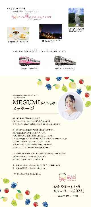 晴れの国おかやま観光キャンペーン推進協議会 おかやまハレいろキャンペーン 2025について 「岡山デスティネーションキャンペーン」及び「森の芸術祭晴れの国・岡山」を契機とした取組や成果を発展・継続させ、今年開催の大阪・関西万博や瀬戸内国際芸術祭 2025との相乗効果による更なる誘客を目指し、「アート」と「食」をメインテーマとして、全県的な観光キャンペーンを開催する。 1 キャンペーン期間 令和7年7月19日(土)〜10月31日(金) 2 実施主体 晴れの国おかやま観光キャンペーン推進協議会 (岡山県、観光関係団体、JR西日本をはじめとする事業者など42団体) 3 キャッチフレーズ等 「こころ晴ればれおかやまの旅」 4 イメージキャラクター 岡山県出身の俳優・プロデューサーである「MEGUMI」さんをイメージキャラクターに起用し、「美をつくる岡山の旅」と題して、ふるさと岡山の魅力を発信 5 期間中の主な企画 (1)アートに関する企画 ・森の芸術祭の恒久設置作品を巡るアート周遊バス ・森の芸術祭のレガシーをマスキングテープで彩る「mt project鏡野」 ・瀬戸内国際芸術祭 2025会場の宇野港エリアの展示作品を巡るシャトルバス ・ジャパンレッドで彩られた町並みで幻想的なライティング演出等を行う「吹屋アート展」 (2)食に関する企画(晴れの国ガストロノミー※) ・旬の白桃やぶどう狩りが楽しめる「おかやまフルーツ狩りバス」 ・笠岡諸島で島グルメなど各島の魅力に触れる「船で巡る三島周遊グルメツアー」 ・香川県と連携した大型グルメイベント「岡山×香川つながる食の大博覧会」 ・ぶどうづくしのフレンチランチを堪能できる「ぶどう畑のレストラン」や県内各地のマイクロワイナリーのワインを味わうワインツーリズム ※晴れの国ガストロノミー:ガストロノミーとは「美食学」のことで、晴れの国おかやまの豊かな食材・習慣・伝統・歴史などによって育まれた岡山ならではの特別な食体験 (3)岡山の夜を楽しむ企画 ・夜の美術館を舞台に謎解きを楽しむ「大原美術館 ×倉敷考古館ミステリーツアー」 ・生演奏を聴きながら夜の美術館(備前市美術館)を楽しむ「ナイトミュージアム」 ・キャンドル灯りに照らされた庭園で星空と音楽に包まれる「蒜山スターウォッチングと星の音楽会」 ・岡山後楽園での「夏の幻想庭園」や岡山城での「夏の烏城灯源郷」 (4)歴史・文化に関する企画 ・国宝の講堂での「特別史跡旧閑谷学校 坐禅体験」 ・桃太カ伝説が生まれた吉備路エリアを巡る「吉備ロマン無料循環バス」 ・伝統工芸の新たな担い手となった米国出身の木工作家による漆塗り体験 等のワークショップ「蒜山郷原漆器体験ツアー」 (5)その他 ・ AI音声キャラクターによるガイドで県内を巡るデジタルスタンプラリー ・天文王国おかやまの天文・星空関連施設を巡る「星めぐりモバイルポイントスタンプラリー」 ・観光列車「SAKU美SAKU楽」「La Malle de Bois」の運行 6 関連企画(ハレ旅宿泊割引プランの販売) (1)概要 大阪・関西万博に多く訪れる国内外からの観光客の岡山県への周遊・宿泊を促進するため、県内の宿泊施設に割引価格で宿泊できる宿泊プランをオンラインで販売する。 (2)割引予定人数 6,000人分 (3)宿泊割引の内容 ┌───┬──────────┬───────┬───────┐ │対 象│ 割引額・適用条件 │ 割引適用期間 │ 販売期間 │ ├───┼──────────┼───────┼───────┤ │海 外│大 人 5,000円/人泊│令和7年6月1日 │令和7年5月20日│ │ │子ども 2,500円/人泊│ 〜10月31日│ 〜10月31日│ ├───┼──────────┼───────┼───────┤ │国 内│大 人 5,000円/人泊│令和7年7月19日│令和7年5月20日│ │ │子ども 2,500円/人泊│ 〜10月31日│ 〜10月31日│ │ │(2人以上での利用が条件) │ │ └───┴──────────┴───────┴───────┘ ※販売開始:5月20日(火)正午 (4)プランと販売サイト ┌───┬───────────────┬─────────────┐ │対 象│ プラン │ 販売サイト │ ├───┼───────────────┼─────────────┤ │海 外│@JR宿泊セット(Kansai WIDE │ │ │ │ Area Pass+岡山県内宿泊)│Trip.com │ │ │A宿泊のみ │ │ ├───┼───────────────┼─────────────┤ │国 内│@JR宿泊セット │ │ │ │ (JR往復+岡山県内宿泊) │・日本旅行(@及びA) │ │ │A宿泊のみ │・tabiwaトラベル(@のみ)│ └───┴───────────────┴─────────────┘ ※割引対象:宿泊料金が大人は1泊10,000円以上、 子どもは1泊 5,000円以上(子ども料金適用) 7 主なプロモーション ・キャンペーン専用ガイドブックの配布やポスターの掲出 ・岡山観光WEBでのイベントや特別企画の紹介 https://www.okayama-kanko.jp/cp 岡山観光 [検索] ・大阪・関西万博会場や観光イベント等でのキャンペーンPRの実施 ・SNS等インターネットを活