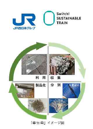 西 日 本 旅 客 鉄 道 株式会社 ジェイアール西日本商事株式会社 オ カ モ ト 株 式 会 社 平 林 金 属 株 式 会 社 忘れ物傘の「傘to傘」リサイクルの取り組みについて 西日本旅客鉄道株式会社は、「JR西日本グループ環境基本方針」のもと、循環型社会構築に貢献できる取り組みを推進しています。この度、ジェイアール西日本商事株式会社、オカモト株式会社、平林金属株式会社と4社協働で、駅や列車における忘れ物傘に着目したサーキュラーエコノミーの取り組みを始めましたのでお知らせします。 1. 忘れ物傘について 駅や列車における傘の忘れ物は、1ヶ月で約9,000本(近畿エリア)にも及び、そのうち廃棄せざるをえない傘は、主に産業廃棄物処理を行っています。 2.忘れ物傘の「傘to傘」リサイクルの流れ @廃棄する傘のうち、ビニール傘を収集(約4000〜5000本/月) A金属部分とシート部分に分別 Bシート部分についてペレットへ加工し、再生シートを生成、製品化 Cビニール傘として利用 ※ペレットは傘以外の製品にも利用可能 例:ネームホルダー、クリアファイル、小物ケース等 3.導入効果 今回の取り組みにより、シート部分の再資源化が可能となり、ビニール傘のリサイクル率は重量比で約90%まで向上、産業廃棄物の削減と資源の有効利用が図れます。 4.今後の予定 ・リサイクル傘は、株式会社JR西日本ヴィアインが運営するJR西日本ヴィアインホテルズの貸し出し傘として導入を予定しています。 ・リサイクル傘の活用先の拡大や、ペレットを活用した傘以外の製品化を検討していきます。 |