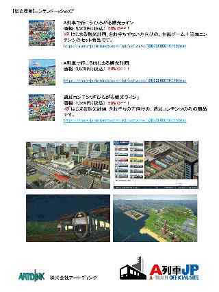 Nintendo Switch 2でも「はじまるA列車」を遊ぼう! 「A列車で行こう はじまる観光計画」50%OFFセールを開始! 株式会社アートディンクは、Nintendo Switch用ソフト「A列車で行こう はじまる観光計画」関連商品のセールを、本日2025年5月29日(木)より開始いたしました。 2025年6月18日(水)までの期間限定で特別価格にて販売いたします。 「はじまる観光計画」セールについて 今回のセールでは、ゲーム本編と追加コンテンツのセット商品「A列車で行こう ひろがる観光ライン」をはじめとする、Nintendo Switch版「A列車で行こう はじまる観光計画」関連製品が50%OFFの半額になります! 期間は6月18日(水)23:59までです。 本ソフトは、Nintendo Switch 2でもそのままお遊びいただけます! Nintendo Switch 2をご購入予定の方も、Nintendo Switchで遊びたい方も、この機会にご購入ください。 鉄道を使った、日本式の街づくりをはじめましょう! 【販売場所】ニンテンドーeショップ A列車で行こう ひろがる観光ライン 価格:5,203円(税込) 50% OFF! ※「はじまる観光計画」をお持ちでない方向けの、本編ゲーム+追加コンテンツのセット商品です。 https://store-jp.nintendo.com/list/software/70070000015199.html A列車で行こうはじまる観光計画 価格:3,839円(税込) 50% OFF! https://store-jp.nintendo.com/list/software/70010000030779.html 追加コンテンツ「ひろがる観光ライン」 価格:1,364円(税込) 50% OFF! ※「はじまる観光計画」をお持ちの方向けの、追加コンテンツのみの商品です。 https://store-jp.nintendo.com/list/software/70050000036455.html ■「A列車で行こう はじまる観光計画」について プレイヤーは鉄道会社の社長として、線路を延ばし、インフラ整備を行い、多くの人を運びます。 そうすることで街が発展し、会社の収益も増えていきます。 会社の成長とともに、街をどう発展させるかはあなた次第。あなただけの、街の未来をつくってみませんか? はじめての方も安心!充実のチュートリアルで徹底的にサポートいたします。 そして、「A列車」×「観光」は、追加コンテンツでさらに“ひろがる”! 「観光計画」をより楽しめるよう、 『はじまる観光計画』は『ひろがる観光ライン』へとアップグレード。 実在する全国の観光列車、新幹線などの追加や、街の風景を加工できる「フォトモード」といった機能で、 あなたの街をもっとひろげましょう! ◆「A列車jp」について A列車で行こうシリーズポータルサイト、「A列車jp」(https://www.atrain.jp)で「A列車」の世界を知りつくせ! 「A列車jp」は、都市開発鉄道シミュレーションゲーム「A列車で行こう」シリーズの情報が集まるポータルサイトです。 サイト内には、「なぜ鉄道で街づくり?」「どんな鉄道路線があるの?」といった疑問を解消する、鉄道と街づくりに関わるコラムを多数掲載中です。コラムで知った内容をゲームに活かして、よりA列車の世界を楽しみましょう。 A列車で行こう公式ポータルサイト「A列車jp」: https://www.atrain.jp/ 【製品詳細】 製 品 名 A列車で行こう はじまる観光計画 / ひろがる観光ライン 発 売 日 好評発売中 価 格 6,980円(税込7,678円) / 9,460円(税込10,406円) 公式サイト https://www.artdink.co.jp/a-tourism/ |