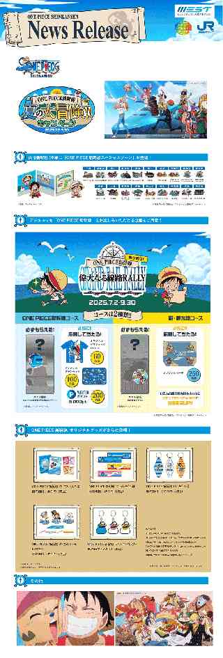 山陽新幹線全19駅を、『ONE PIECE』各篇の舞台になぞらえ、その駅でしか見ることができないスポットとする「ONE PIECE新幹線スペシャルゾーン」が登場。新しいオリジナルアートや、各駅の観光地を『ONE PIECE』の1シーンと名セリフで表現するなどにより「偉大なる線路(グランドレイル)」を盛り上げます。