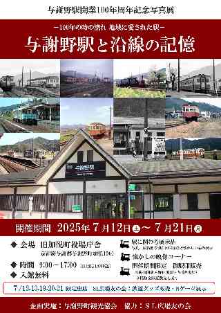 与謝野町観光協会 この度、与謝野駅開業100周年記念企画として、 写真展〜100年の時の流れ 地域に愛された駅〜 「与謝野駅と沿線の記憶」 を開催します。 鉄道カメラマンや地域の方にご提供いただいた写真から厳選した作品を展示します。 他にも実際に使用されていた駅名標や切符回収箱、廃線鉄道「加悦鉄道」などの鉄道関連グッズ販売、懐かしの映像の放映など予定しております。 ★SL広場友の会:7/12.13.19.20.21 限定出店 鉄道グッズ販売・Nゲージ展示 【入場は無料です】 ◆開催期間:2025年7月12日?〜7月21日? ◆会 場:旧加悦町役場庁舎 2階議場(京都府与謝郡与謝野町加悦1060) 与謝野町観光協会 TEL 0772-43-0155 ◆時 間:9:00〜17:00(7/21は15:00まで) 【主 催】与謝野町観光協会 【協 力】SL広場友の会 |
