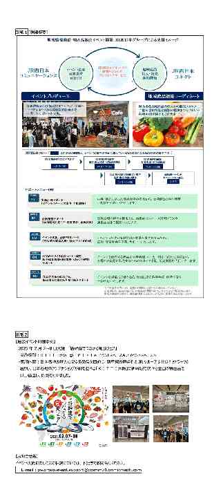 西 日 本 旅 客 鉄 道 株式会社 株式会社JR西日本コミュニケーションズ 株式会社 J R 西 日 本 コ ネ ク ト 煩雑な準備はすべてお任せ! 駅等スペースでの地域情報発信イベントをJR西日本グループが支援します JR西日本グループは、駅ナカ催事スペースの情報発信力を生かし、地域の皆さまとともに地域魅力の発信、地域活性化に貢献しています。このたび、西日本旅客鉄道株式会社、株式会社JR西日本コミュニケーションズ、株式会社JR西日本コネクト(※)の3社が連携し、イベントの企画や地産品の仕入・物流の調整、及び販売員の確保などを一気通貫で支援する「ワンストップサービス」を開始することとなりましたのでお知らせいたします。これまでは情報発信者にて調整が必要であった各種準備の負担が抑えられ、より簡易でお手軽にイベントが実施できるようになります。当社グループの駅スペースで、地域の魅力を発信してみませんか。 ※駅構内一部店舗の運営管理等を中心に、JR西日本グループのサポート事業を行う潟Wェイアール西日本デイリーサービスネットの子会社 1.対象 主に、自治体・DMO・観光協会・商工団体・一般社団法人等が、JR西日本の主要駅やショッピングセンター等の催事スペースにて、地域魅力の発信を目的に観光誘客や地産品販売のイベントを実施する際、出店の支援をいたします。 2.サービス内容(詳細:「別紙1」) ・催事スペースの見繕い、手配 ・催事スペースにおける制作物の作成、媒体による宣伝告知の支援 ・地産品販売における仕入・物流の調整、販売スタッフの手配 ・食品等の販売における、販売場所に応じた衛生面での支援 ※有償での支援となります。 ※実施場所・内容・費用等は個別調整となります 3.本サービスを活用したイベント事例(詳細:「別紙2」) ・実施実績:2025年2月「新幹線でつながる旬食フェア」 ※上記イベントは本サービスの試行としてKITTE大阪「@JPCafe」にて実施 4.その他 JR西日本グループの「地域活性化ソリューション」や「駅ナカ催事スペース」を公式HPで紹介しています。 JR西日本公式HP: https://www.westjr.co.jp/company/action/region/ |