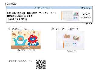 西 日 本 旅 客 鉄 道 株 式 会 社 株式会社ジェイアール西日本デイリーサービスネット 「2025大阪・関西万博 記念ICOCA」の 万博会場外(オンライン)での追加発売について JR西日本グループでは、2025年大阪・関西万博の開催にあわせて、「2025大阪・関西万博 記念ICOCA」(以下、「万博記念ICOCA」)付商品を発売しております。 ご要望のあった会場外発売について、この度WESTERモールにて発売することを決定いたしました。つきましては、概要をお知らせいたします。 1.万博会場外(オンライン)での発売について (1) 商品詳細 cExpo 2025 アイテム(セット):2025大阪・関西万博 記念ICOCA・フォトフレームセット 限定数量:15,000セット予定(おひとり様1点限り) 価格(税込) :3,200円 ※配送料別 ・上記セットは、2025大阪・関西万博公式ライセンス商品です。 ・上記価格には、万博記念 ICOCA1枚 1,000 円(SFチャージ500 円、デポジット500円)の代金を含みます。 ・国内のご指定住所までの配送料がかかります。 ・おひとり様1点限りの販売となります。 なお、おひとり様で複数個のご注文が確認された場合は、ご注文をキャンセルさせていただきます。ひとりでも多くのお客様にお買求めいただけるよう、ご理解とご協力をお願いいたします。 ・販売状況によりご購入いただけない場合もありますので、あらかじめご了承ください。 @ ICOCAカードについて デザインについて:ICOCAのキャラクター「カモノハシのイコちゃん」と「ミャクミャク」が2025年大阪・関西万博をきっかけに出会い、仲良くなりました。世界中からたくさんの人やモノが集まる万博!大阪グルメを楽しみながら大阪・関西の魅力を全国のお客様にお届けします! ・万博記念ICOCA単品では発売しておりません。本リリースに記載の発売アイテム(万博記念ICOCAとグッズのセット)でのみ、ご購入いただけます。 ・大阪・関西万博の会場外や開催期間外でも、通常の ICOCA として鉄道やバス、お買い物にご利用いただくことができます。(ICOCA 定期券に変更することはできません。) ・大人用のみの発売です。お子様用にご購入いただくことはできますが、鉄道やバス等を利用すると大人運賃が引き去りされますので、ご注意ください。 ・JR 西日本等の駅の窓口等では発売しません。 A フォトフレームについて 優しい線画で描かれたイコちゃん&ミャクミャクが台紙に登場。中面はシンプルデザイン+キャラクターシールで自由にアレンジ可能。ICOCAと写真を飾れば、思い出のフォトフレームに早変わり! (2) 発売方法 WESTERモール内の「おみやげ街道【関西】WESTERモール店」にて販売いたします。以下、URLもしくは二次元コードより商品詳細ページへアクセスください。 ※万博来場者向けオンラインストア(EXPO2025 来場者向け オフィシャルオンラインストアJR西日本グループ)での販売ではございません。 商品詳細URL:https://wester-mall.westjr.co.jp/79d8632b-9738-4d26-b37a-2bc4df50bbc2.html?sitetype=1 ※ 直前に万博来場者向けオンラインストアにアクセスされた場合、商品詳細ページが正常に表示されないことがございます。その場合は一度WESTERモールのトップページにアクセスした後、商品詳細ページへアクセスしてください。 <二次元コード> *伊藤注:添付画像をご利用下さい。 ・販売予定数(15,000セット)に達し次第受付を終了させていただきます。 ・本商品は、他商品との同時購入ができません。 ・受付完了後、準備が整い次第順次発送となります。なお、配送日および配送時間の指定はできません。 ・ご注文以降順次発送を行いますが、商品のお届けまで最長で1か月程度お時間をいただく場合がございます。 ・ご購入に際し、店舗受取サービスはご利用いただけません。所定住所への配送のみとなります。 ・国内指定住所へと発送になります。海外への発送は行っておりません。 (3) 販売開始日 8月19日(火)12:00予定 ※ 販売開始の2時間前(午前10:00)より商品詳細ページへアクセスすると待合室が表示されます。 ※ 販売開始時刻(12:00)以降、順次商品詳細ページへご案内しますので、待合室が表示された後はそのままお待ちください。 ※ 商品詳細ページへは午前10:00〜11:59の間に商品詳細ページにアクセスし待合室が表示された方から順にご案内します。その後、販売開始時刻(12:00)以降に商品詳細ページにアクセスし待合室へご入室になった方を商品詳細ページへ順にご案内します。 (待合室の詳細については商品詳細ページをご確認ください。) (4) その他 ・営利目的と疑われる複数購入や、第三者への転売行為は禁止させていただいております。該当する注文が確認された場合は、弊社の判断により注文をキャンセルする場合がございますので、ご了承ください。 ・商品購入後、お客様都合による返品・交換は対応いたしかねます。 ・その他の詳細については、「WESTERモール内のご利用ガイド」をご参照ください。 ・過去の「万博記念ICOCA」)付商品に関するお知らせは以下となります。 @ 4月11日 ICOCA「大阪・関西万博 記念 ICOCA」の
