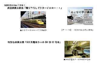 2025年 8月 7日 京都鉄道博物館 http://www.kyotorailwaymuseum.jp 9月開催のイベントのおしらせ 話題のあの車両に注目! 鉄道映像上映会「撮り下ろしドクターイエロー!!」 9月のワークショップは、ドクターイエローの映像上映を行います。当館の職員が923形T5編成(700系新幹線型)に添乗し、撮影した映像をご紹介!また、922形T3編成先頭車(0系新幹線型)がリニア・鉄道館(愛知県名古屋市)からトレインパーク白山(石川県白山市)に移送される様子もご覧いただけます♪ 【開 催 日】9月20日(土)・21日(日) 【開催時刻】@11:00 A13:30 B15:00(所要時間約45分) 【開催場所】本館3F ホール 【参 加 料】無料(要入館料) 【定 員】各回50名(先着順) ※「京都鉄道博物館 ワークショップスタンプカード」対象です。 鉄道を様々なテーマで解説♪ 「おとなの学び講座」 9月の「おとなの学び講座」は、駅弁をテーマに、当館の学芸員が解説します。 【開 催 日】9月18日(木) 【開催時間】14:00〜15:00(所要時間60分) 【開催場所】本館3F ホール 【テ ー マ】「駅弁のあゆみと特徴」 【参 加 料】無料(要入館料) 【定 員】約50名(先着順、開催時刻15分前に開場) 【講 師】岡本 健一郎(学芸員) ※「京都鉄道博物館 おとなの学び講座スタンプカード」対象です。 普段は見学出来ない車両を公開! 特別な車両公開「583系電車クハネ581形35号車」 当館では週末を中心に、展示車両の車内を公開しています。 9月の車両は、1967(昭和42)年に登場した「583系電車クハネ581形35号車」です。昼は座席車、夜は寝台車になる世界初の昼夜両用電車として開発されました。この機会にぜひ車内をご見学ください。 【開 催 日】土曜日・日曜日・祝日 【開催時間】10:00〜16:30(12:00〜13:30は休止) 【開催場所】本館1F クハネ581形35号車 1日限定! SLスチーム号のけん引機にDE10形ディーゼル機関車が登場! 1日限定でSLスチーム号をDE10形ディーゼル機関車がけん引♪ 【開 催 日】9月16日(火) SLスチーム号について 【運行時間】11:00〜16:00の間で、概ね30〜60分に1本運行 (詳しい時刻は、当館公式Webサイトで前日に公表します。) 【開催場所】SLスチーム号のりば 【乗車料金】大人(高校生以上):300円 子ども(3歳〜中学生):100円 ※SLスチーム号のりば設置の券売機で乗車券をお買い求めください。 |