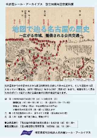 〒453-0012 愛知県名古屋市中村区井深町1番1号 新名古屋センタービル・本陣街1209号室 https://www.nagoyara.com/ 名古屋レール・アーカイブス 設立20周年記念資料展 名古屋市が今の中区の広さから周辺市町村を合併して徐々に広がり、そして現在の16区となっていく歴史を、1878(明治11)年から1967(昭和42)年まで、地図を楽しく見るためのポイント紹介と共に会員所蔵の23枚の地図で辿ります。 期 間:2025(令和7)年9月17日(水)〜10月13日(月) 開館時間:10:00〜18:00(土・日・祝は10:00〜17:00) 休 館 日:月曜日(祝日・休日の場合はその翌日) ※最終日の10月13日(月・祝)は開館します 会 場:名古屋都市センターまちづくり広場(金山南ビル11階) 交 通:JR・名鉄・地下鉄「金山」駅南口すぐ ●記念講演1)「名古屋の鉄道の歴史に迫る」 9月21日(日)13:30〜 ●記念講演2)「金山総合駅と都市計画」 10月 5日(日)13:30〜 |