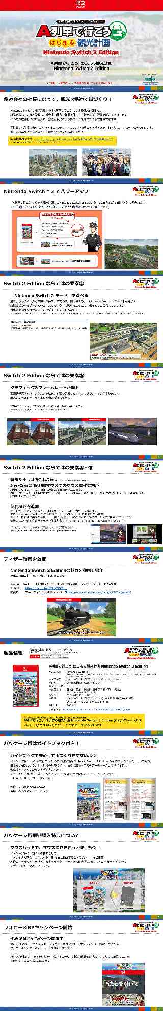 発売元・企画・開発アートディンク ■A列車で行こう はじまる観光計画 Nintendo Switch 2 Edition 都市開発鉄道SLG / 2025年12月18日(木)発売予定 公式HP:https://www.artdink.co.jp/japanese/title/a-tourism/sw2/ A列車公式サイト:https://www.atrain.jp/ ◎メディア パッケージ(ガイドブックパック)/ダウンロード ◎ジャンル 都市開発鉄道シミュレーション ◎プレイ人数 1人 ◎対応言語 日本語、英語、中国語(繁体字/簡体字)、韓国語 ※シナリオの追加は日本語のみです。 ◎価格 パッケージ(ガイドブックパック)9,460円(税込10,406円) ダウンロード8,980円(税込9,878円) 既に「はじまる観光計画」「ひろがる観光ライン」をお持ちの方向け A列車で行こうはじまる観光計画Nintendo Switch 2 Edition アップグレードパス ◎価 格 2,000円(税込2,200円) ※ダウンロード版のみ販売します 鉄道会社の社長になって、観光×鉄道で街づくり! NintendoSwitchで好評発売中の「A列車で行こうはじまる観光計画」は、線路を敷いて沿線を開発し、観光地の魅力で発展を促して、様々な街の課題を解決するSLGです。 かつて鉄道会社が取り組んだ、鉄道と観光による街づくりをあなたの手で体感できます。 個性豊かな登場人物たちが、ていねいにチュートリアルや攻略のアドバイスをくれるため、はじめての方も安心です。 頼れるみんなと一丸となって、理想の街を実現しましょう! 無料体験版を配信中!: https://store-jp.nintendo.com/item/software/D70010000030779 ※有料DLC「ひろがる観光ライン」の内容が含まれています。 フォロー&RPキャンペーン開始 発表記念キャンペーン開催中 抽選で10名様に「ニンテンドープリペイド番号2000円(オンラインコード版)」が当たる、フォロー&リポストキャンペーンを開始しました! ARTDINK公式X(@artdink_tw)をフォローし、対象の投稿をリポストするだけで応募できます。 開催期間:9/2(火)23:59まで |