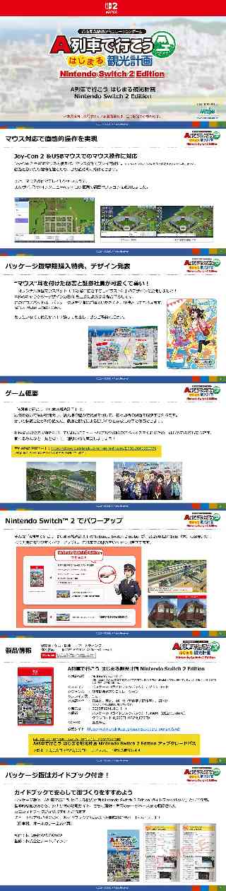発売元・企画・開発アートディンク ■A列車で行こう はじまる観光計画 Nintendo Switch 2 Edition 都市開発鉄道SLG / 2025年12月18日(木)発売予定 公式HP:https://www.artdink.co.jp/japanese/title/a-tourism/sw2/ A列車公式サイト:https://www.atrain.jp/ 特典画像公開など、追加情報です。 無料体験版を配信中!: https://store-jp.nintendo.com/item/software/D70010000030779 ※有料DLC「ひろがる観光ライン」の内容が含まれています。 |