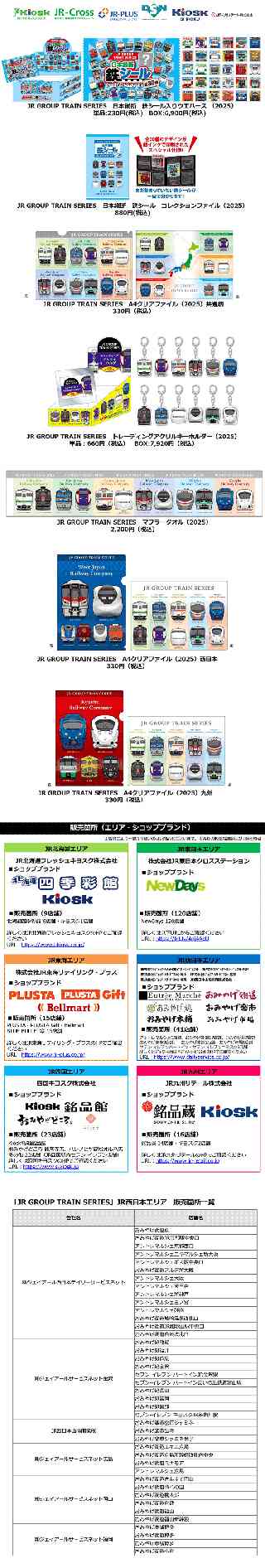 JR 北 海 道 フ レ ッ シ ュ キ ヨ ス ク株式会社 株式会社 JR 東 日 本 ク ロ ス ス テ ー シ ョ ン 株式会社 JR 東 海 リ テ イ リ ン グ・ プ ラ ス 株式会社ジェイアール西日本デイリーサービスネット 四 国 キ ヨ ス ク 株 式 会 社 J R 九 州 リ テ ー ル 株 式 会 社 全国のJRグループ駅ナカ小売業6社共同企画! 「JR GROUPTRAIN SERIES」 9月30日以降発売 ●毎年ご好評をいただいている、全国のJRグループ駅ナカ小売業6社による共同企画を今年も実施し、9月30日(火)から発売いたします。 ●歴史のある鉄道を身近に感じ、その魅力を知ってもらうため、鉄道グッズ等の販売を通じて全国規模で「鉄道」を盛り上げていきます。 商品ラインナップ 【発売日】2025年9月30日(火) ・JR GROUP TRAIN SERIES 日本縦断 鉄シール入りウエハース(2025) 単品:230円(税込)BOX:6,900円(税込) 表面にはJR6社の車両イラスト、裏面には各車両の解説が書かれた「鉄シール」付きウエハースです。 JRグループ6社×5車両の全30車両で、本年のみの特別な車両の組み合わせとなっています。 1BOX購入でコンプリートできます。(※未開封に限ります)全車両描きおろしイラストです! ・JR GROUP TRAIN SERIES 日本縦断 鉄シール コレクションファイル(2025) 880円(税込) 「鉄シール」全30種類をファイリングできるコレクションファイルです。 ・JR GROUP TRAIN SERIES A4クリアファイル(2025)共通柄 330円(税込) JRグループ6社×2車両の全12車両でデザインしたA4クリアファイルです。 本年のみの特別な車両の組み合わせとなっています。全車両描きおろしイラストです! ・JR GROUP TRAIN SERIES トレーディングアクリルキーホルダー(2025) 単品:660円(税込)BOX:7,920円(税込) JRグループ6社×2車両の全12車両を封入したトレーディングアクリルキーホルダーです。 本年のみの特別な車両の組み合わせとなっています。 全車両描きおろしイラストです!1BOX購入でコンプリートできます。(※未開封に限ります) ・JR GROUP TRAIN SERIESマフラータオル(2025) 2,200円(税込) JRグループ6社×2車両の全12車両でデザインしたマフラータオルとなります。 全車両描きおろしイラストです! ・JR GROUP TRAIN SERIESA4クリアファイル(2025)西日本 330円(税込) JR西日本の車両6種類と、JRグループ5社の車両2種類ずつ、合計16種類の車両をデザインしたJR西日本店舗限定A4クリアファイルです。本年のみの特別な車両の組み合わせとなっています。 全車両描きおろしイラストです!表面は西日本車両のみでデザインした特別仕様です。 JR GROUP TRAIN SERIES A4クリアファイル(2025)九州 330円(税込) JR九州の車両5種類と、JRグループ5社の車両2種類ずつ、合計15種類の車両をデザインしたJR九州店舗限定A4クリアファイルです。本年のみの特別な車両の組み合わせとなっています。 全車両描きおろしイラストです!表面は九州車両のみでデザインした特別仕様です。 ※画像、イラストは全てイメージです ※JR北海道商品化許諾済、JR東日本商品化許諾済、JR東海承認済、JR西日本商品化許諾済、JR四国承認済、JR九州承認済 |