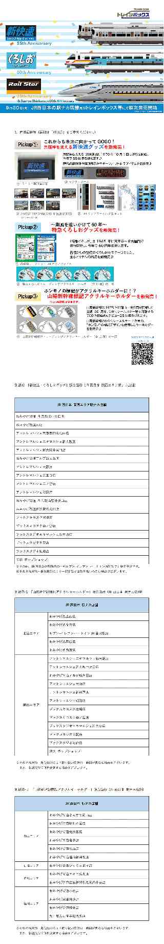 2025年 9月26日 ジェイアール西日本商事株式会社 祝「新快速」「くろしお」「ひかりレールスター」周年記念 9月30日より全14アイテムを新発売!! 2025年のJR西日本は「新快速」の運行開始55周年や「くろしお」運行開始60周年、700系E編成「ひかりレールスター」運行開始25周年など、お祝い事が目白押しな1年です! JR西日本の鉄道デザイングッズブランド「トレインボックス」では、新快速・特急くろしおを中心とした全14アイテムを2025年鉄道の日記念グッズとして新発売します! 通勤・通学・観光など、たくさんの想い出や日常を支えた列車の歴史をモチーフとしたグッズで、あの頃の風景を思い出してみてはいかがでしょうか。 1.商品画像等(詳細は「別紙B」をご参照ください。) Pickup@ これからも未来に向かってGOGO! 京阪神を支える新快速グッズを新発売! 京阪神を支える「新快速」は、1970年10月1日に運行を開始。 今年で55周年を迎えます♪ 歴代の新快速や種別表示をモチーフとした全7アイテムを新発売♪ @ ミニミニ種別表示幕 AJRWEST TRADINGCARD 新快速 SERIES Bマフラータオル CA4クリアファイル 2枚セット PickupA 〜潮風を追いかけて60年〜 特急くろしおグッズを新発売! 「特急くろしお」は1965年に天王寺〜名古屋間で運行開始し、今年で60周年を迎えます。 昔懐かしの歴代のくろしおをモチーフとした、全6アイテムの商品を新発売♪ @ 避難用リーフレット A4クリアファイル A 特急くろしおトレーディングアクリルキーホルダー(全10種)の一部 PickupB ホンモノの標記がアクリルキーホルダーに!? 山陽新幹線標記アクリルキーホルダーを新発売! ※16両編成は除きます。 山陽新幹線は1975年に岡山―博多間が開業して全通50周年、ひかりレールスター等で活躍する700系E編成もデビュー25周年を迎えます。 山陽新幹線のひかりレースルター・こだまの、”ホンモノ“の標記デザインを使用したキーホルダーを新発売♪ @ 山陽新幹線標記トレーディングアクリルキーホルダー(全10種)の一部 2.発売日 2025年9月30日(火)より順次発売開始 3.販売箇所 ・京都鉄道博物館ミュージアムショップ ・JR西日本の駅ナカ店舗(詳細別紙@A) ・ジェイアール西日本商事通販サイト「トレインボックス」 (https://www.trainbox.jp) ・JR西日本公式産直オンラインショップ「DISCOVER WEST mall」 (https://dwmall.westjr.co.jp/shop/default.aspx) ・トレインボックス WESTERモール店 (https://wester-mall.westjr.co.jp/) ※店舗によりお取り扱いのない場合がございます。 詳細は「別紙@A及び、別紙B商品詳細」をご参照ください。 ※サイト内検索ワード「新快速」&「特急くろしお」&「鉄道の日」 4.おしらせ ・JR西日本公式産直オンラインショップ「DISCOVER WEST mall」は、以下のリンクからアクセスいただけます。 https://dwmall.westjr.co.jp/shop/default.aspx ・内容・価格や販売箇所は変更する場合がございます。 また、急遽販売を終了する場合がございます。 ・記載の販売価格は、ECサイトでの税込価格となります。 (販売箇所によっては販売価格が異なる場合がございます。) ・発売日や商品の仕様は、予告なく変更する場合がございます。 ・販売箇所によって取扱商品が異なります。発売開始日に商品がご用意出来ていない場合もありますので、あらかじめご了承ください。 ・それぞれの画像はイメージ図です。実際と異なる場合がございます。 ・一部実際の車両・標記と異なる場合がございますので予めご了承ください。 ・以下の公式SNSでも当商品をご紹介いたします。 「トレインボックス」(ジェイアール西日本商事株式会社) Facebook :https://www.facebook.com/jrwtrading/ X(旧)Twitter:https://x.com/TRAIN_BOX Instagram :https://www.instagram.com/trainbox_jrwt/ |