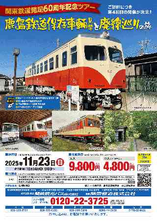 関 鉄 観 光 バ ス 関東鉄道グループの関鉄観光バスでは、鹿島鉄道保存会、鉾田駅保存会などの協力の下、「鹿島鉄道保存車両見学と廃線巡りの旅」の4回目のツアーを11月23日(日)に催行します。 鹿島鉄道の現存車両6両の見学のほか、リニューアルした鹿島鉄道記念館(普段は非公開)の見学、霞ケ浦湖畔の廃線跡の散策、旧坂戸駅・鉾田駅の見学、キハ601のライトアップなど盛り沢山です。 JR石岡駅東口9時受付、18時30分解散予定で、36名限定(最少催行人員20名)です。 参加費は大人9,800円。 10月14日(火)から9:00〜18:00にツアー専用フリーダイヤル(0120-22-3725)で参加申込みを受付けます。 ※時間外と日祝はお申し込みいただけません。 |