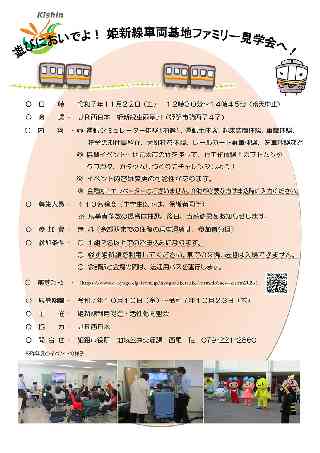 姫新線利用促進・活性化同盟会では、姫新線の利用促進を目的に、普段見ることができない鉄道の舞台裏である車両基地において、ファミリー見学会を開催します。 1 日 時 …令和7年11月22日(土) 12時30分〜14時45分(荒天中止) 2 会 場 …JR西日本 姫新線車両基地(姫路市飾西 747) 3 内 容 … ◎運転シミュレーター体験(抽選)、運転士体験、起床装置体験、車掌体験、指令のお仕事紹介、犬釘打ち体験、レールカート乗車体験、洗車体験など ◎協賛イベント 地元太市の竹を使って、竹工作体験!カブトムシやクワガタ、カタツムリづくりにチャレンジしよう! (姫路市自然観察の森の職員のアドバイスのもと工作します。) ※イベントによっては一部内容が変更になるものがあります。 ※会場内にエレベーターはございません。介助が必要な方は申込時に入力ください。 4 募集人員 …110名程度(中学生以下は、保護者同伴) ※応募者多数の場合は抽選のうえ、後日、当落結果をお知らせします。 5 参加費 …無 料(余部駅までの往復の乗車運賃は、参加者負担) 6 参加条件 … ○1組2名以上でのお申込みになります。 (ファミリー向けイベントになります。1名でのお申込みはご遠慮ください。) ○必ず姫新線を利用してください。 車での来場、送迎は入場できません。 ○余部駅と会場の間は、送迎用バスを運行します。 7 応募フォーム … ( https://www.e-hyogo.elg-front.jp/hyogo/uketsuke/form.do?acs=kishin2025) 8 問合せ …〒670-8501 姫路市安田4丁目1番地 姫路市役所 地域公共交通課 (電話) 079-221-2860 9 応募期間 …令和7年10月10日(金)〜令和7年10月23日(木) 10 主 催 …姫新線利用促進・活性化同盟会 11 協 力 …JR西日本 |