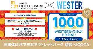 西 日 本 旅 客 鉄 道 株 式 会 社 三井不動産商業マネジメント株式会社 WESTERポイント1,000ポイントがもらえる 「三連休はJRで三井アウトレットパーク 倉敷へICOCA!」 キャンペーンを開催します 西日本旅客鉄道株式会社は、2026年1月10日(土)〜1月12日(月・祝)の3日間、三井不動産商業マネジメント株式会社(東京都中央区)が運営する三井アウトレットパーク倉敷と連携し、「三連休はJRで三井アウトレットパーク 倉敷へICOCA!」キャンペーンを実施いたします。 当日、鉄道(JR倉敷駅)をご利用のうえ、三井アウトレットパーク 倉敷にて5,000円(税込・合算可)以上お買上げいただいたWESTER会員様にWESTERポイント(基本)1,000ポイントをプレゼントいたします。 ぜひこの機会に三井アウトレットパーク 倉敷へICOCAでお越しください。 1. 概要 (1)実施時期 2026 年1月10日(土) 〜 2026 年1月12日(月・祝) (2)キャンペーン内容 以下の条件をクリアした方にWESTERポイント(基本)1,000ポイントをプレゼントいたします。 【条件】 @ ICOCAで鉄道利用(JR倉敷駅で降車) A 三井アウトレットパーク 倉敷にて合計5,000円(税込・合算可)以上お買い上げ ※条件@、Aともに同一日に達成する必要がございます。 【参加方法】 1・まだ登録されていない方は、WESTERアプリをダウンロードのうえ、会員登録ください。 2・WESTERアプリにお持ちのICOCA番号をご登録ください。 ※別紙1 3・上記「条件2」で登録したICOCAを使ってJR倉敷駅を利用しご来場ください。 4・三井アウトレットパーク 倉敷にて当日合計5,000円(税込・合算可)以上お買い上げいただいたレシートをキャンペーン会場までお持ちください。 ※決済手段は問いません 5・WESTERアプリのP表示をタップし、バーコードをご提示ください。 ※JR倉敷駅の利用は降車のみ対象となります。 ※期間中1日1回まで、条件達成当日のみ特典獲得が可能です。 ※特典のWESTERポイント付与は各日先着100名様までとさせていただきます。 2.その他 ・本キャンペーンの詳細は下記のホームページをご覧ください。 <URL:キャンペーンページはこちら > ・期間中はお出かけにぴったりなイベントを多数開催いたします。詳しくは三井アウトレットパーク 倉敷のホームページをご覧ください。 <URL:三井アウトレットパーク倉敷 > 〈別紙1〉キャンペーンの注意事項 【参加方法】 ●キャンペーンの参加には、WESTER会員登録およびWESTERアプリへのICOCA番号のご登録が必要です。 ICOCA番号の登録は、WESTERアプリのホーム画面上部の「会員メニュー」「マイページ」「登録されているICOCA番号を見る」から行うことができます。 ●一度登録したICOCA 番号は変更できません。また、再発行などでICOCA番号が変わった場合、変更後のICOCA番号はポイント特典付与の対象外となります。カードタイプのICOCAをApple PayのICOCAに移行(取り込み)した場合、ICOCA番号が変わるのでご注意ください。 ※獲得したポイントや履歴は、WESTERアプリのP表示をタップしご確認いただけます。 【付与ポイント内容及び付与時期】 ●特典は、WESTERポイント(基本)を付与いたします。ポイントは当日付与いたします。 【注意事項】 ●WESTERポイントサービスの内容および適用条件などについては、WESTER サービス規約の定めるところによります。 ●お客様の個人情報は「WESTER 会員プライバシーポリシー」および「個人情報の取り扱いに関する当社の基本方針」の記載に準じて取り扱います。WESTER会員・サービスについては、下記からご確認ください。 ●対象となる交通系ICカードは、「ICOCA」「SMART ICOCA」「モバイルICOCA」「Apple Pay のICOCA」です。(他の交通系 IC カードは対象外です。) ●やむを得ない事情により、本キャンペーンの運営を事前の予告なく中断・中止・終了または本キャンペーンの WEB ページおよび規約に掲載されている内容を変更する場合がございます。予めご了承ください。またこれらの中断・中止・変更・終了等によるいかなる損害に対しても、当社は、一切の責任を負いかねます。 ●本キャンペーンの利用および閲覧は、お客様ご自身の自己責任において行われるものであり、本キャンペーンのご利用に起因するソフトウェア・ハードウェア上の事故・通信・設定等その他のいかなるトラブル・損害・事故についても、一切責任を負いかねます。 ●WEB サイトやアプリへの接続料および通信料は、お客様のご負担になります。 ●メンテナンス等でキャンペーンにご参加いただけない場合がございます。予めご了承ください。 ●キャンペーンに関して、ご質問や、ポイント付与についてのお問い合わせ等は、お受けできない場合がございます。 ●OS の種類やバージョンによっては、キャンペーンサイトが正しく表示できない場合がございます。予めご了承ください。 WESTER ポイント規約についてはこちら: https://wester.jr-odekake.net/terms/point-kiyaku/ WESTER 会員プライバシーポリシー: https://wester.jrodekake.net/terms/privacypolicy/ 個人情報の取り扱いに関する当社の基本方針: https://www.westjr.co.jp/guide/privacy.html 