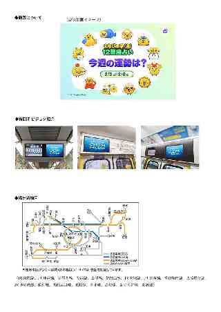 株式会社JR西日本コミュニケーションズ 「えもじの子(仮)」と、電車時間をもっと楽しく! 電車内サイネージで12星座占いコンテンツを配信します このたび株式会社JR西日本コミュニケーションズは、LINEヤフー株式会社と協力し、人気キャラクター「えもじの子(仮)」とのコラボコンテンツを、JR西日本の電車内デジタルサイネージ(WESTビジョン)でお届けすることになりました。 ◆動画について 12星座になったえもじの子(占)が今週のみなさまの運勢を占います!通勤・通学のちょっとした時間に、うれしいヒントや癒しをお届けする動画です。LINEを飛び出し、電車の中でふいに出会えるえもじの子(占)と、電車時間をお楽しみください。 ◆配信詳細 配信期間:2026年2月2日(月)〜3月1日(日)(予定) 場所:JR西日本の車両内に設置しているデジタルサイネージ(WESTビジョン) ※一部車両を除く 時間:朝夕の通勤・通学時はもちろん、平日・休日問わず、幅広い時間帯にご覧いただけます。 配信コンテンツ:えもじの子(占)12星座占い 今週の運勢 ※各星座のラッキーカラーや詳しい運勢は毎週LINE占いでご覧いただけます。 URL:https://lin.ee/y3qQ0ZQ ◆「えもじの子(仮)」紹介 気づいたらあなたのLINEにいたえもじの子(仮)。 「えもじの子(仮)」は、日常の感情を素朴に表現したシンプルなデザインが特徴のLINE発のキャラクターです。2024年に登場以降、SNSなどで「気持ちが伝わる」「ちょうどいい表情」と話題となり、絵文字以外の使い方(プロフィール画像・トーク装飾など)でも親しまれています。リリースからわずか数か月でシリーズ累計ダウンロード数は数百万件を突破し、「日常トークの主役」として定着しています。 ◆WESTビジョン紹介 JR西日本の車両に設置されている「WESTビジョン」は、映像ならではの高い視認性を誇るデジタル媒体です。移動中のひとときに自然と乗客の視線を集め、情報や広告をしっかり届けることができます。また、関西エリアを中心に広範囲の路線をカバーしているため、多くのお客さまに向けて効果的な発信が可能です。 ◆掲出路線図 (JR京都線、JR神戸線、琵琶湖線、湖西線、山陽線、福知山線、JR宝塚線、JR東西線、学研都市線、大阪環状線、JRゆめ咲線、阪和線、関西空港線、北陸線、草津線、赤穂線、きのくに線、羽衣線) *伊藤注:添付画像をご覧下さい。 |