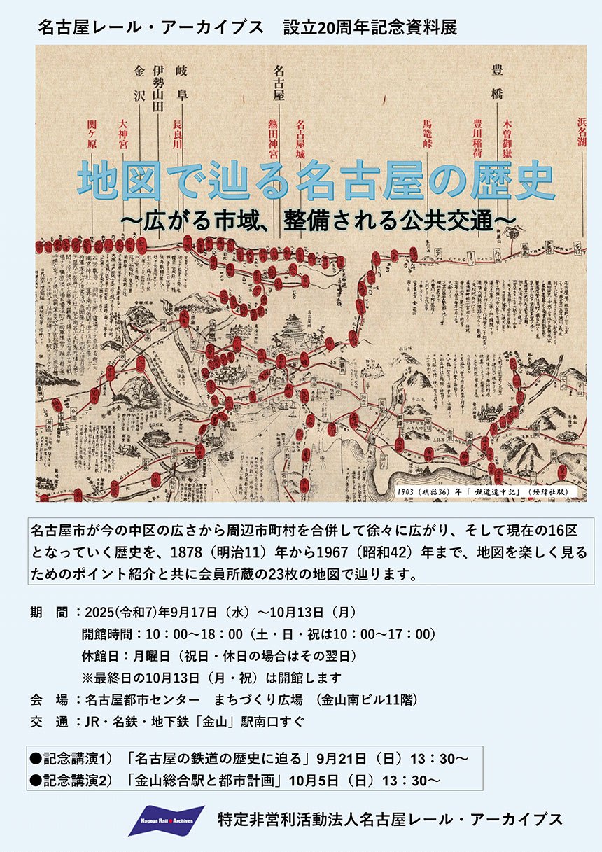 キャプション: 名古屋レール・アーカイブス 設立20周年記念資料展のチラシ