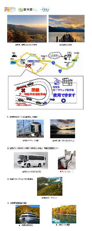 日光市・栃木県・東武グループ 紅葉時期の日光で渋滞対策を推進し、エコで快適な観光の標準化を目指します。 〜混雑を避けたストレスフリーな日光観光で、 日常を忘れて心と身体を満たす贅沢な秋を〜 日光市、栃木県、東武グループでは、国内有数の観光地「日光」において、日光の最繁忙期である紅葉シーズンにあわせ、マイカー利用に対する渋滞対策を実施いたします。 紅葉の名所として有名な奥日光地域の玄関口であるいろは坂は、紅葉シーズンを中心とした行楽シーズンにおけるマイカー渋滞が発生し、CO2(二酸化炭素)排出により周辺環境に負担をかけています。その渋滞緩和施策として、マイカー渋滞のボトルネックの一つとなっている明智平県営駐車場を、最も混雑が見込まれる 11/1(土)〜3(月・祝日)の3日間に限り試験的に封鎖したうえで交通誘導を実施します。また、紅葉シーズンである10〜11月は、中禅寺湖周辺にある観光施設の早朝営業等により、いろは坂における道路混雑の平準化を目指します。これら官民連携の取り組みにより、渋滞対策とそれに伴う CO2(二酸化炭素)の削減を3者一体となり推進していきます。 詳細は別紙のほか、日光市公式観光 WEB(https://www.nikko-kankou.org/features/%20congestion)のとおりです。 今後も「雲の上のサステナブルリゾート奥日光」の実現に向け、環境負荷低減を目指す取り組みを実施するとともに、混雑を避けたストレスフリーな日光観光や、マイカー利用から公共交通利用へのモーダルシフト等を推奨してまいりますので、観光でお越しになる皆様のご理解・ご協力のほど、お願いいたします。 <<別紙1>> 【紅葉時期における交通渋滞対策の実施について】 平日またはオフピーク(15:00〜9:00)観光および、ピーク時(土・日・祝の 9:00〜15:00)における公共交通機関の利用を推奨するとともに、各種取り組みを実施します。 【明智平県営駐車場閉鎖】※社会実験の実施 11/1(土)〜3(月・祝日)の3日間、いろは坂の交通渋滞対策として明智平県営駐車場を閉鎖します。 明智平は右側に明智平ロープウェイ、左側に明智平県営駐車場があり、これまで駐車場入庫待ちの車により渋滞発生の原因となっていました。今回、明智平県営駐車場を閉鎖することで、左車線を中禅寺湖方面への通過車両、右車線を明智平ロープウェイへの車両とすることで、渋滞の軽減に努めます。 また、駐車場閉鎖に伴い、駐車場入口に誘導員を配置するとともに案内看板及び周知看板を設置します。 ★奥日光方面へは左車線をご利用ください。 実施主体 栃木県県土整備部交通政策課、日光土木事務所 問合せ先 栃木県交通政策課:028-623-2409、日光土木事務所:0288-53-1212 WEBサイト https://nikkotrafficinfo.jp/ <<別紙2>> 【オフピーク施策について】 公共交通機関を利用してストレスフリーな日光観光をお楽しみください。 @臨時夜行列車「日光紅葉夜行」の運行 概 要:浅草駅を23:45に出発し、東武日光駅に2:16に到着する夜行列車で、途中、北千住・新越谷・春日部の各駅からも乗車可能です。夜行列車として深夜時間帯に出発することで混雑を避けつつ、奥日光の色鮮やかな紅葉を早朝からお楽しみいただけます。 WEBサイト:https://tobutoptours.jp/nikko-kinugawa/nikkoyako/ (東武トップツアーズ) 実施期間:10/18(土)、10/24(金)、10/25(土)、10/31(金)、11/2(日)、11/7(金) 備 考:ご利用の際は東武トップツアーズにお申込みください。 A貸切バス「SPACIA X NIKKO CRUISER」が紡ぐ 早朝紅葉鑑賞ツアー 概 要: R7.10月に運行開始する新型特急「スペーシア X」のデザインコンセプトを継承したハイグレード貸切バス「 SPACIA X NIKKO CRUISER」に乗車できる初めてのツアーです。静寂に包まれた早朝の展望台から眼下に広がる紅葉の絶景と壮大な華厳の滝を静かにゆったりと鑑賞できます。 実施期間:10/19(日)・23(木)〜26(日)、10/30(木).11/3(月)発(1泊 2日) WEBサイト:https://tobutoptours.jp/nikko-kinugawa/spaciaxnikkocruiser/ (東武トップツアーズ) 備 考:ご利用の際は東武トップツアーズにお申込みください。 B明智平ロープウェイの早朝運転 概 要:中禅寺湖、華厳の滝、男体山をはじめとする山並みなど、日光一の絶景スポットと言われる明智平展望台からの眺望を混雑前にお楽しみいただけます。 実施期間:7:30営業開始】 10/20(月)、10/24(金)〜 10/27(月)、 10/31(金)〜 11/4(火)、 11/8(土)〜 11/11(火)、11/16(日) 8:00営業開始】 10/28(火)〜 10/30(木)、11/5(水)〜 11/7(金)、 11/12(水)〜 11/15(土) 8:30営業開始】 10/18(土)〜 10/19(日)、10/21(火)〜 10/23(木) WEBサイト:https://www.nikko-kotsu.co.jp/ropeway/ 備 考:荒天時(霧・強風・雷など)は営業開始時間を変更することがあります。 また、点検整備のため運休する場合があります。 C中禅寺湖遊覧船の増便 概 要:紅葉シーズン中の以下日程において、早朝、夕方に遊覧船を増便します。朝日に映える紅葉の名所・八丁出島や男体山、夕暮れに浮かび上がる山の稜線や夕焼けに染まる中禅寺湖をご堪能ください。 実施期間:早朝増便 8:30発 船の駅中禅寺〜船の駅中禅寺(周回所要時間 30分)】 10/20(