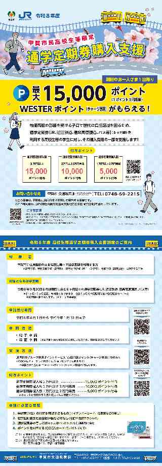滋 賀 県 甲 賀 市 西日本旅客鉄道株式会社 【継続実施】甲賀市高校生等通学定期券購入支援事業の実施(対象者拡大)について 〜ICOCAにチャージできる WESTERポイント進呈〜 滋賀県甲賀市と西日本旅客鉄道株式会社(以下、「JR西日本」という。)は、JR草津線をはじめとした公共交通の利用促進、物価高騰の影響を受ける子育て世帯の負担軽減を目的に、通学定期券をご利用の高校生等の学生の方に対して、お手持ちの ICOCAにチャージしてご利用いただける WESTERポイント(チャージ専用)を最大 15,000ポイント進呈する事業について、令和7年度から取り組んでおります。 この度、令和8年度についても、対象者を拡大し継続して実施することが決まりましたので、お知らせします。今後も滋賀県甲賀市と JR西日本は、更なる連携を図り、鉄道の利用促進の取り組みを進めてまいります。 1.実施期間 令和8年(2026年)4月1日(水)〜令和9年(2027年)1月31日(日)まで 2.対象者 甲賀市内に住民登録のある高校生等※で通学定期券(有効期間 6ヶ月間)をご利用の方。 ※高等学校、特別支援学校(高等部)、高等専門学校(第1〜3学年)、専修学校(高等課程)のいずれかに通学する学生 ※令和8年9月30日を有効期間に含む6カ月間の通学定期(「1カ月/3カ月の定期」も対象ですが合計で6カ月分の定期購入後に各定期券のコピーと共に申請が可能) 3.付与ポイント 通学定期券購入額3万円以上・・・・・・・・15,000ポイント 通学定期券購入額2万円以上3万円未満・・・10,000ポイント 通学定期券購入額1万円以上2万円未満・・・・5,000ポイント ※1ポイント 1円相当の WESTERポイント(チャージ専用) ※通学定期券は、JRや近江鉄道・信楽高原鐵道などの鉄道定期や、バスの定期券も支給対象になります。 4.手続き・付与方法(別紙参照) ICOCAを提示のうえ手続きをしていただくと、翌月末にポイントを進呈します。ポイントは、JR西日本の各駅の自動券売機等で ICOCAにポイントチャージすることで、交通機関やショッピングでご利用いただけます。 5.その他 事業の詳細は、甲賀市ホームページをご参照ください。 |