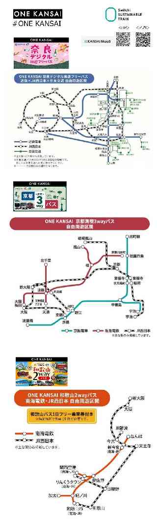 近畿日本鉄道株式会社 京阪電気鉄道株式会社 南海電気鉄道株式会社 阪急電鉄株式会社 奈良交通株式会社 和歌山バス株式会社 西日本旅客鉄道株式会社 大阪市高速電気軌道株式会社 関西がひとつに! “8社連携”で実現する 「ONE KANSAI QR乗車券」継続発売へ 〜関西周遊をもっと自由に、もっと楽しく〜 関西に主要路線を持つ、近畿日本鉄道株式会社(以下、近鉄電車)、京阪電気鉄道株式会社(以下、京阪電車)、南海電気鉄道株式会社(以下、南海電車)、阪急電鉄株式会社(以下、阪急電車)、奈良交通株式会社(以下、奈良交通)、和歌山バス株式会社(以下、和歌山バス)、西日本旅客鉄道株式会社(以下、JR西日本)、大阪市高速電気軌道株式会社(以下、Osaka Metro)は、スマートフォンからすぐに購入可能で有効期間中は乗り放題となる「ONE KANSAI QR乗車券」を発売しています。 2025年11月1日(土)よりご利用いただけるチケットとして各社が連携してつくり上げたこのプロジェクトは『関西全体で観光を支える・盛り上げる』という想いを体現した取り組みで関西外のお客様から多くご利用いただいており、好評につき期間を延長して発売します。 広域エリアを一枚のQR乗車券で快適に移動できる仕組みは全国的にも先進的であり、関西の交流人口を促進し、地域活性化に繋げる取組みです。 各商品の概要は以下のとおりです。デジタル時代にふさわしい“シームレスな関西旅”を提供します。 1.購入方法 「KANSAI MaaS」でのみ発売します。 URL:https://app.kansai-maas.jp/ ※駅の券売機・窓口での発売はありません。 ※購入には「KANSAI MaaS」の会員登録が必要です。 お支払いはクレジットカードのみとなります。 2.利用方法 自由周遊区間内は、「KANSAI MaaS」のチケット画面から乗車券のQRコードを表示し、QRコード対応の改札機にかざしてご乗車ください。 奈良交通は「KANSAI MaaS」のチケット画面から乗車券を表示し、運転者等にご呈示ください。 和歌山バスは指定箇所で事前に「1日フリー乗車券」に引換のうえご利用ください。 3.継続発売商品 (1)近鉄電車×奈良交通×JR西日本連携商品 @商 品 名:ONE KANSAI 奈良デジタル周遊フリーパス A発売期間:〜2027年3月30日(火) ※ご利用日の1ヶ月前からご利用日当日まで発売(発売期間内に限る) B利用期間:〜2027年3月31日(水) ※2026年3月31日(火)、2027年3月31日(水)ご利用開始分の設定はございません。 ※2026年4月1日ご利用日以降の発売開始日は2026年3月20日からとなります。 C有効期間:2日間 ※ご利用日当日の最終列車までご利用できます。 D自由周遊区間:下記エリア *伊藤注:添付画像をご覧下さい。 ※【近鉄電車】特急ご利用の際は別途、特急券の購入が必要です。 【JR西日本】特急列車や新快速Aシート(有料座席サービス)をご利用の際には、 別途、特急券や指定席券の購入が必要です。 E価格:おとな 3,600円(1名様あたり、税込) ※「こども」の設定はありません。 詳しくは下記のHP等をご確認ください。 JR西日本 URL: https://www.jr-odekake.net/ticket/tokutoku/nara_dp/ (2)京阪電車×阪急電車×JR西日本連携商品 @商 品 名:ONE KANSAI京都満喫3wayパス A発 売 期 間 :〜2027年3月31日(水) ※ご利用日の1ヶ月前からご利用日当日まで発売(発売期間内に限る) B利 用 期 間 :〜2027年3月31日(水) ※2026年4月1日ご利用日以降の発売開始日は2026年3月20日からとなります。 C有 効 期 間 :1日間 ※ご利用日当日の最終列車までご利用できます。 D自由周遊区間:下記エリア *伊藤注:添付画像をご覧下さい。 ※【京阪電車】「ライナー」「プレミアムカー」をご利用の際は、 別途、ライナー券・プレミアムカー券の購入が必要です。 【阪急電車】座席指定サービス「PRiVACE」をご利用の際は、 別途、座席指定券の購入が必要です。 【JR西日本】特急列車や新快速Aシート(有料座席サービス)をご利用の際は、 別途、特急券や指定席券の購入が必要です。 E価 格:おとな 1,800円(1名様あたり、税込) ※「こども」の設定はありません。 詳しくは各社のHP等をご確認ください。 京阪電車 URL: https://www.keihan.co.jp/traffic/valueticket/detail/kyotomankitsu-3way.html 阪急電車 URL: https://www.hankyu.co.jp/ticket/otoku/013943.html JR西日本 URL: https://www.jr-odekake.net/ticket/tokutoku/kyoto_3way_pass/ (3)南海電車×和歌山バス×JR西日本連携商品 @商 品 名:ONE KANSAI和歌山2wayパス A発 売 期 間 :〜2026年9月30日(水) ※ご利用日の1ヶ月前からご利用日当日まで発売(発売期間内に限る) B利 用 期 間 :〜2026年9月30日(水) ※2026年4月1日ご利用日以降の発売開始日は2026年3月20日からとなります。 C有 効 期 間 :1日間 ※ご利用日当日の最終列車までご利用できます。 D自由周遊区間:下記エリア *伊藤注:添付画像をご覧下さい。 ※【南海電車】座席指定列車等、特急券または座席指定券が 必要な列車をご利用の際は、別途、料金が必要です。 【JR西日本】特急列車や新快速Aシート(有料座席サービス)を ご利用の際は、別途、特急券や指定席券の購入が必要です。 E価 格:おとな 3,600円(1名様あたり、税込) ※「こども」の設定はありません。 詳しくは下