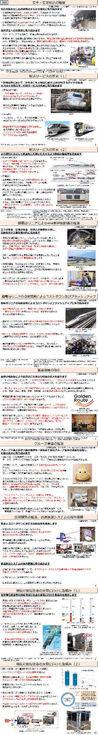 東海旅客鉄道株式会社 2026年度重点施策と関連設備投資について 2026年度も、鉄道の原点であり、全ての施策の大前提となる安全の確保を最優先として、社員一人ひとりが日々の業務に真摯に取り組むとともに、訓練等を通じて能力・技術を向上させます。その上で、生活様式や働き方の変化、労働力人口の減少等、当社を取り巻く環境が変化していることを踏まえ、AIを含め最新のICT等の技術を活用して効率的な業務執行体制を構築する「業務改革」と新しい発想による「収益の拡大」の2つを柱とした経営体力のさらなる強化に取り組みます。日本の大動脈輸送の維持・発展に不可欠な中央新幹線については、品川・名古屋間の総工事費が増加する見通しとなったことを踏まえ、プロジェクト管理機能を強化し、早期実現に向けて取り組みます。 これらについて「自由に考え、大いに議論し、粘り強くやり抜く」ことで、当社グループの総力を挙げて「日本の大動脈と社会基盤の発展に貢献する」という経営理念をより高いレベルで実現します。 1.重点施策(別紙参照) ■安全・安定輸送の確保 ■輸送サービスの充実 ■超電導リニアによる中央新幹線計画の推進 ■超電導リニアの技術開発によるコストダウン及びブラッシュアップ ■営業施策の強化 ■グループ事業の推進 ■技術開発の推進、高速鉄道システムの海外展開 ■持続可能な社会の実現に向けた取組み 2.設備投資額 連結:7,780億円、単体:7,180億円 ※中央新幹線関連の設備投資額:3,670億円 中央新幹線関連を除いた設備投資額(単体):3,510億円、うち安全関連投資:2,440億円 |