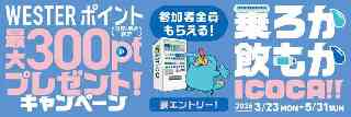 西 日 本 旅 客 鉄 道 株 式 会 社 株式会社ジェイアール西日本デイリーサービスネット 鉄道×駅ナカ自販機curico WESTERポイント(期間・用途限定)最大300pt プレゼント!キャンペーンを実施します! 西日本旅客鉄道株式会社(大阪府大阪市北区、代表取締役社長 倉坂 昇治)、株式会社ジェイアール西日本デイリーサービスネット(兵庫県尼崎市、代表取締役社長 中西 豊)は、2026年3月23日(月)〜5月31日(日)において、JRと駅ナカ自販機curicoを利用すると、参加者全員にWESTERポイント(期間・用途限定)を最大300ptプレゼントするキャンペーンを実施します。この機会に便利な鉄道と駅ナカ自販機curicoをぜひご利用ください。 1.概要 (1)実施期間 2026年3月23日(月)〜5月31日(日) (2)参加方法 事前にWESTERアプリでWESTER IDによるログインをしていただいた上で、WESTERアプリの「おトクにGO!」より、「WESTERポイント(期間・用途限定)最大300ptプレゼント!キャンペーン」を選択し、「さっそくスタート!」からキャンペーンにご参加ください。 ※エントリーは2026年3月23日(月)9:00から可能です。 ※ご参加後のWESTER IDの変更はできません。 (3)ポイント付与 全ての条件を達成すると、全員にWESTERポイント(期間・用途限定)を最大300pt付与いたします。 ※各条件の達成は、おひとり様1回のみ有効です。 紐づけされているICOCA番号のご確認 ログイン中のWESTER IDに紐づけ(利用登録)されたICOCA番号の一覧がホーム画面に表示されますのでご確認ください。紐づけがされていない場合はWESTER会員サポートページにログインし、「WESTERポイント(チャージ専用)付与対象ICOCA登録・変更・削除」メニューからICOCA番号の登録を行ってください。複数のICOCA番号が表示されている場合、すべてのICOCA番号でのご利用が対象となります。 STEP1(アンケートへのご回答) ホーム画面からかんたんなアンケートに回答すると、全員にWESTER ポイント(期間・用途限定)50ptを付与します。 STEP2(駅ナカ自販機curicoのご案内画像の閲覧) ホーム画面から駅ナカ自販機curicoの概要や特徴を記載したご案内画像を閲覧いただくと、全員にWESTER ポイント(期間・用途限定)50ptを付与します。 STEP2(鉄道・駅ナカ自販機curicoのご利用) 鉄道を1回利用し、駅ナカ自販機curicoで飲料を1本購入すると、WESTER ポイント(期間・用途限定)200ptを付与します。 ○鉄道のご利用(@またはAのいずれかで達成となります) @e5489のご利用 Aご登録いただいたICOCAでのJR西日本ICOCAエリア内のご乗車 ○駅ナカ自販機curicoでのご購入 ご登録いただいたICOCAでの駅ナカ自販機curicoの決済 ※全ての駅ナカ自販機curicoが対象です。 ※STEP1を達成されていない場合、STEP2の達成とはなりません。なお、対象期間内にSTEP2の達成条件となる鉄道・駅ナカ自販機curicoのご利用をされていれば、STEP1達成後にスタンプが押印されます。 ※対象期間内であれば、STEP2の達成の順序やタイミングは問いません。複数日に渡ってチャレンジしていただくことも可能です。 2.その他 (1)キャンペーンの詳細ならびにご利用条件などは下記のホームページをご覧ください。 https://wester.jr-odekake.net/campaign/detail/012027030902 ※2026年3月13日(金)までにオープンします。 (2)ポイント付与時期等 本キャンペーンの特典として付与されるのは、WESTERポイント(期間・用途限定)です。有効期限は、付与された日の翌月末です。 WESTERポイント特典付与は、2026年8月上旬頃を予定しております。 ※「ICOCA」は西日本旅客鉄道株式会社の登録商標です。 |