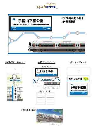 2026年 3月10日 ジェイアール西日本商事株式会社 <fint size="4"> 山陽線の新駅「手柄山平和公園駅」開業記念! 駅名標グッズを2026年3月14日(土)より新発売 〜「駅名標」をデザインした記念グッズで新駅開業を盛り上げます〜 ジェイアール西日本商事株式会社(代表取締役社長:平島道孝/所在地:兵庫県尼崎市)は、2026年3月14日(土) 山陽線 姫路駅〜英賀保駅間に新駅「手柄山平和公園駅」が開業を迎えることを記念し、同日より「駅名標」をデザインした記念グッズを新発売いたします。 ◆「駅名標」をクローズアップした3種類の開業記念グッズ 本商品は、多くのお客様に親しみのある「駅名標」をクローズアップし、実際のデザインを忠実に再現しています。 新たな玄関口として誕生する新駅を身近に感じていただけるよう、キーホルダー、A6リングノートとマグネットの3種類をご用意いたしました。 地域の新たな一歩を祝う記念グッズとして、ぜひお手元でお楽しみください。 <商品概要> @駅名標キーホルダー 販売価格:550円(税込) サイズ:約30×79mm 手柄山平和公園駅の駅名標を精巧に再現したキーホルダー。 カバンや鍵に付けて、いつでも新駅を感じられます。 AA6リングノート 販売価格:660円(税込) サイズ:A6 内容数(本文):50枚綴り ※表紙・裏表紙除く 手柄山平和公園駅の駅名標と、同駅に停車する223系がデザインされたA6サイズのリングノート。 日常使いにも、旅の記録にも最適です。 B駅名マグネット 販売価格:440円(税込) サイズ:約40×60mm 駅名標のデザインをあしらったマグネット。 ご家庭や職場の冷蔵庫やホワイトボードを彩ります。 <販売概要> 1.発売日 2026年3月14日(土) 2.販売箇所 ●JR西日本の一部駅ナカ店舗(ブックスタジオ姫路、ブックスキヨスク尼崎等) ●京都鉄道博物館ミュージアムショップ ●ジェイアール西日本商事通販サイト「トレインボックス」 (https://www.trainbox.jp) ●「トレインボックス」 WESTERモール店 (https://wester-mall.westjr.co.jp) ●JR西日本公式産直オンラインショップ「DISCOVER WEST mall」 (https://dwmall.westjr.co.jp/shop/default.aspx) 3.おしらせ ・販売場所により取扱商品や発売日が異なる場合があります。 また、急遽販売を終了する場合があります。 ・商品仕様、価格や販売箇所は変更する場合があります。 ・それぞれの画像はイメージ図です。実際と異なる場合があります。 ・一部実際の車両・標記と異なる場合があります。 ・以下の公式通販サイト、SNSでも当商品をご紹介予定です。 トレインボックス:https://www.trainbox.jp/ Facebook :https://www.facebook.com/jrwtrading/ X(旧Twitter) :https://x.com/TRAIN_BOX Instagram :https://www.instagram.com/trainbox_jrwt/ ■「手柄山平和公園駅」について これまで駅間距離が長かった姫路駅〜英賀保駅間の鉄道アクセスが向上するとともに、2026年10月に「大和工業アリーナ姫路」が開館予定である手柄山平和公園へも自由通路を通って駅から直接アクセス出来るようになります。 また、全ての新快速・快速・普通列車に加え、通勤特急「らくラクはりま」も停車します。 |