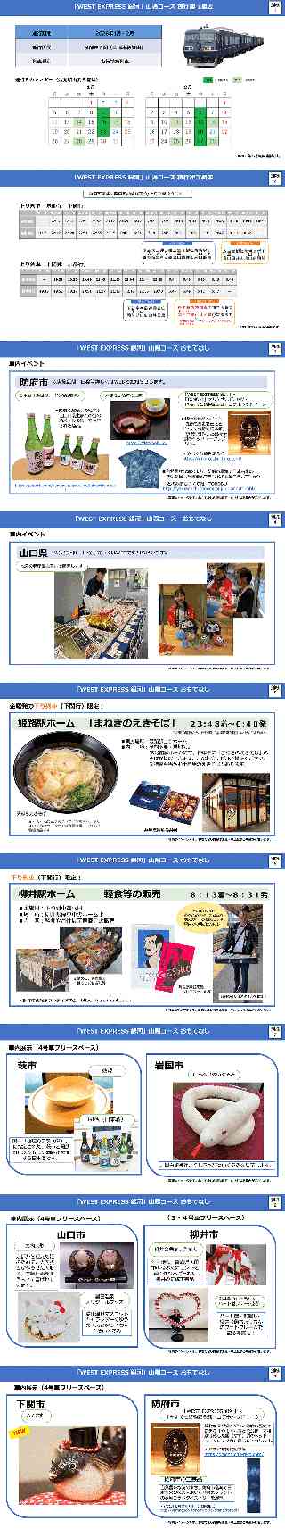 JR News ミライ JR西日本グループ Release もっとつながる。未来が動き出す 2025年12月 1日 西日本旅客鉄道株式会社 2025年度「WEST EXPRESS 銀河」山陽コース夜行運転 1〜2 月のおもてなしについて 2026年1月・2月に運行する、観光列車「WEST EXPRESS 銀河」山陽コース 夜行運転のおもてなしについてお知らせします。 1 夜行運転概要(別紙1.2) ・運行区間:京都駅〜下関駅 ・列車種別:夜行特急列車 ・運転期間:2025年1月9日(金) 〜 2026年2月28日(土)(始発駅出発日基準) 2 おもてなしについて(別紙3〜9) 停車駅や車内にて山陽コースならではのおもてなしをたくさんご用意しています。詳細は別紙3〜9 をご覧下さい。 3 発売方法(夜行) ○JR西日本ネット予約サービス「e5489」、全国のみどりの窓口、みどりの券売機プラスで発売いたします。 ・各運行日の 1か月前の10時から発売いたします。 ・e5489では、きっぷ発売開始日の7日前の5時30分から「事前申込サービス」をご利用いただけます。(ファーストシート、クシェット、リクライニングをご利用の場合でWESTER 会員の方に限ります。) ・京阪神エリアからだけでなく、広島・山口エリアからもご利用可能です。購入可能な発着駅は別紙2 をご確認ください。 ○「tabiwa トラベル」での発売 特別にきっぷの通常販売に先行して旅行商品を販売する予定です。12月上旬以降に決まり次第ホームぺージでお知らせさせていただきます。 ※一部の運行日については、tabiwa トラベル限定発売のご用意がない場合がございます。 「WEST EXPRESS 銀河」に関する情報はホームページでもご覧いただけます。 https://www.jr-odekake.net/railroad/westexginga/ |
