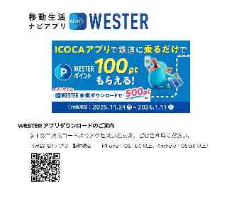 JR News ミライ JR西日本グループ Release もっとつながる。未来が動き出す 2025年11月24日 西日本旅客鉄道株式会社 ICOCAアプリと鉄道でポイントたまる!WESTERをはじめよう! キャンペーン開催! 西日本旅客鉄道株式会社(本社:大阪市北区、代表取締役社長:倉坂昇治、以下JR西日本)は、2025年11月24日(月)から2026年1月11日(日)まで、ICOCAアプリでJR西日本の鉄道に乗車すると、WESTERポイント(基本)が100ポイントもらえる「ICOCAアプリと鉄道でポイントたまる!WESTERをはじめよう!キャンペーン」を開催します。これに合わせ、WESTERアプリを初めてダウンロードしWESTER IDでログインされたお客様は、WESTERポイント(基本)500ポイントをプレゼントいたします。 年末年始のご移動も含め、WESTERポイントをおトクに獲得できるこの機会をぜひご体験ください。 NEWS 『鉄道に乗つておトク』概要 対象期間中に、WESTERアプリをお持ちの方が、同じWESTER IDでログインしたICOCAアプリのチャージ残額を使って1回以上、※対象の鉄道に乗ると、WESTERポイント(基本)を100ポイントプレゼントいたします。 ※ICOCAアプリでのJR西日本のICOCAエリア内の駅相互間の利用が対象です。 ※JR西日本のICOCAエリア外の駅を含むご利用は対象外です。(JR四国・アストラムライン・ハピラインふくい・IRいしかわ鉄道・あいの風とやま鉄道など) ※ICOCAアプリが使える場合も、PiTaPaエリアなどJR西日本以外のエリア・区間でのご利用は対象外です。 キャンペーン期間 2025年11月24日(月)0時00分〜2026年1月11日(日)23時59分 ポイント付与時期 2026年2月上旬頃を予定しています。 NEWS 『新規WESTERダウンロードでおトク』概要 対象期間中に、WESTERアプリを初めてダウンロードし、WESTER IDでログインすると、WESTERポイント(基本)を500ポイントプレゼントいたします。 キャンペーン期間 2025年11月24日(月)0時00分〜2026年1月11日(日)23時59分 ポイント付与時期 2026年2月上旬頃を予定しています。 各キャンペーンの詳細はキャンペーンページをご覧ください。 https://wester.jr-odekake.net/campaign/detail/012026112401 |
