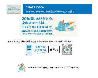 JR News ミライ JR西日本グループ Release もっとつながる。未来が動き出す 2025年11月26日 西日本旅客鉄道株式会社 SMART ICOCA クイックチャージを含む会員サービスを終了 西日本旅客鉄道株式会社が発行するカードタイプの交通系ICカード「SMART ICOCA(スマートICOCA)」について、モバイルICサービスのご利用拡大に伴い2024年12月に新規発売を終了しました。その他の各種サービスについても、下記のとおり順次終了させていただく運びとなりましたのでお知らせいたします。長年にわたりSMART ICOCAをご利用いただいたお客様には、心より感謝申し上げます。 概要はこちら. https://www.jr-odekake.net/icoca/smarticoca/together_since_2006 NEWS01 終了予定日とサービス 終了予定日:2026年10月31日 クイックチャージ(クレジットカードによるチャージ) 終了予定日:2026年12月10日(※1) ・SMART ICOCAセンターでの紛失再発行(※2) ・会員情報の変更(※3) 終了予定日:2027年2月17日 ・WESTERポイント(基本)からWESTERポイント(チャージ専用)への交換 ・WEBでご利用履歴・ ICOCAご利用分ポイント履歴の照会(※4) ※1:受付終了日(SMART ICOCAセンター到着分まで) ※2:終了後にSMART ICOCAを紛失した場合、JR西日本のICOCAエリアの駅のみどりの窓口、もしくは改札口の係員にお申し出 いただき、翌日以降に通常のICOCAで再発行いたします。 ※3:終了後にSMART ICOCAの氏名を変更する場合、JR西日本のICOCAエリアの駅のみどりの窓口で氏名変更を承ります。 ※4:SMART ICOCA会員は退会となるため照会できなくなりますが 、WESTER会員サービスは引き続きご利用いただけます。 NEWS02 引き続きご利用いただけるサービス 通常のICOCAとおおむね同等のサービスを継続してご利用いただけます。 (1)チャージ残額のご利用(鉄道・バスのご利用やお店などでのお支払い) (2)現金チャージ、ポイントチャージ (3)定期券の搭載 ※JR西日本の定期券に限ります (4)紛失再発行、障害再発行(券面の著しい劣化等によるカード交換) NEWS SMART ICOCAの代替サービス モバイルICOCA for Android / Apple PayのICOCAは、お持ちのモバイルデバイスで、登録したクレジットカード等でのチャージや定期券の購入、チャージ残額や利用履歴のご確認、WESTERポイントのチャージがどこでも可能です。よりベンリにICOCAをご利用いただけます。 NEWS04 モバイルICサービスならではのおトクなキャンペーン (1)当面継続予定のキャンペーン J-WESTゴールドカードでのチャージや定期券購入でWESTERポイント(基本)が 最大3% たまる! ※1,000円(税込)につき30ポイント ※J-WESTカードで最大1.5%[1,000円につき15ポイント]※期間は当面の予定 モバイルICOCA for Android▼ https://www.jr-odekake.net/icoca/campaign/mobilebirth/ Apple PayのICOCA▼ https://www.jr-odekake.net/icoca/applepay/j-westcard/ (2)今だけ!おトクなキャンペーン @ お買い物はモバイルでICOCA! 7% トクしちゃおう! 【概 要】 モバイルICOCA でのお買い物で、7%をWESTERポイント(チャージ専用)で還元 【対象期間】 2025年12月1日 〜 2025年12月31日 詳しくはこちら▼ https://www.jr-odekake.net/icoca/campaign/okaimono_cp_2025/ A J-WESTゴールドカードでのチャージで最大3% たまる「J-WESTカードでチャージしトク!?」 【概 要】 J-WESTゴールドカードでモバイルICOCA(または Wesmo!)へのチャージで最大3%(J WEST カード:最大1.51.5%)のWESTERポイント(期間・用途限定)を還元。 \さらに/初めてJ-WEST カードでモバイルICOCA(またはWesmo!)へチャージをされた方に1,000 WESTER ポイント(期間・用途限定)を還元。 【対象期間】 〜2025年12月31日まで(12月31日までにチャージされた金額が対象です) 詳しくはこちら▼ https://wester.jr-odekake.net/j-west/campaign/charge_cp_2025/ B JR西日本でのIC乗車で運賃の 1% 相当のWESTERポイント(基本)がたまる! 【概 要】 JR西日本のICOCAエリア内の駅相互間のご利用で運賃の1%相当のポイントを還元。 【対象期間】 〜2026年6月30日まで ※iPhoneのAppleウォレットのみでのご利用は対象外。ICOCAアプリをダウンロードしてご利用ください。 詳しくはこちら▼ https://www.jr-odekake.net/icoca/mobile/train-point/ 長年にわたり「SMART ICOCA」をご利用いただきました皆様には、心より感謝申し上げます。 今後とも、JR西日本のサービスをご愛顧いただきますよう、よろしくお願い申し上げます。 2006年からのご愛顧、本当にありがとうございました。 ●Androidは Google LLC の商標です。 ●Apple、Apple Pay、Apple Payロゴ は Apple Inc.の登録商標です。●画像はイメージです。 ●「ICOCA」「SMART ICOCA(スマートICOCA)」「モバイルICOCA」は西日本旅客鉄道株式会社の登録商標です。 ※記載の内容はすべて現時点での情報であり、変更となる可能性があります。 |