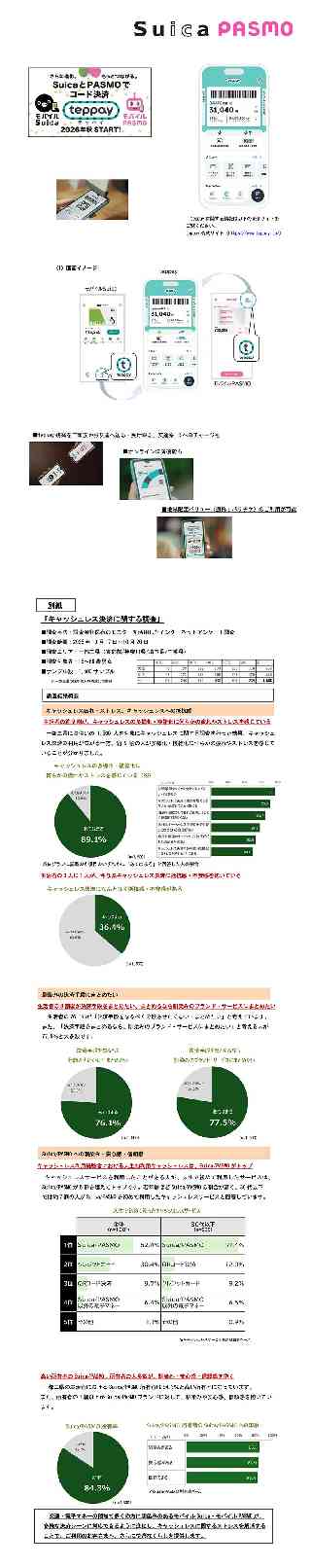2025年11月25日 東日本旅客鉄道株式会社 株 式 会 社 パ ス モ P A S M O 協議会 Suica・PASMOのコード決済サービス「teppay」を2026年秋より提供開始 ○東日本旅客鉄道株式会社(以下「 JR東日本」)は、モバイル Suicaのアップデートを行い、新たにコード決済サービス「teppay(テッペイ)」を2026年秋より提供開始する予定です。 ○また、2027年春には株式会社パスモ(以下「パスモ」)と提携し、モバイルPASMOにおいても「teppay(テッペイ)」の提供を開始予定です。 ○モバイルSuica・モバイルPASMOのアプリさえあれば、新たにアプリのダウンロードや登録をすることなく「teppay」の機能として「コード決済」「残高の送付」「オンライン決済」等のサービスがご利用可能となります。また、特定の地域でご利用いただける「地域限定バリュー」機能も提供します。 ○ JR東日本が行った「キャッシュレス決済に関する調査」の中で、多くの生活者がキャッシュレスの多様化・複雑化に対して何らかのストレスを感じており、馴染みのサービスにまとめたいというニーズがあることがわかりました。このニーズに対応するため、交通・電子マネーの領域でお馴染みの決済手段となっているモバイル Suica・モバイル PASMOが、より多様な決済シーンに対応できるよう進化します。 1. teppayについて モバイルSuica・モバイルPASMOのアップデートに合わせて、アプリ内にコード決済「teppay」を提供開始します。提供開始日は決まり次第別途お知らせします。 【teppayの特長】 そのまま使える →既にモバイルSuica・モバイルPASMOをご利用の方は新たなアプリダウンロードや登録が不要 アプリを超えてつながる →モバイルSuica・モバイルPASMOのアプリを超えて残高を「送る・受け取る」ことが可能 2.teppayの機能でできること (1)画面イメージ ・モバイルSuica・モバイルPASMOのトップ画面がリニューアルされ、追加された teppayボタンを押すと画面が切り替わります。 ・teppay残高には、銀行口座・ATM(現金)等のほか、ビューカードでのご入金が可能です。 ・teppay残高からモバイル Suica・モバイル PASMOの交通系 ICへチャージが可能です。 ・モバイルSuicaとモバイルPASMOの間で teppay残高を「送る・受け取る」ことが可能です。 (2)便利な機能 ■コード決済で高額のお買い物が可能に ・モバイルSuicaとモバイルPASMOの交通系IC残高の上限額(2万円)を超えるお買い物が可能です。 ・teppayにビューカードを連携すると、チャージ不要でお買い物が可能です。 ・決済時にはお買い物にもご利用いただける teppayポイントが付与されます。 ・teppayマークのあるお店 (※1)のほか、Smart CodeTMマーク(※2)がある全国 160万か所以上で利用可能です。 ※1:Suica・PASMO等の交通系電子マネーが使えるお店と、teppayが使えるお店は異なります。 ※2:株式会社ジェーシービーが提供する統一コード決済スキーム。数値は 2025年10月末時点の情報です。 ■teppay残高をご家族やお友達へ送る・受け取る、交通系 ICへのチャージも ・teppayユーザー同士で「残高を送る・受け取る(※1)」ことが可能です。モバイルSuicaとモバイルPASMOでアプリを超えたやり取りが可能です。 ・teppay残高(※2)から交通系IC残高へのチャージ(※3)や、モバイルSuica・モバイルPASMO定期券等の購入が可能です。 ※1:交通系IC残高を「送る・受け取る」ことはできません。 ※2:teppay残高の銀行口座・ATM(現金)等への出金はできません。 ※3:鉄道やバスのご利用は交通系IC残高でのご利用となります。 ■オンライン決済機能も ・teppay残高をインターネットでのお買い物にご利用いただける「teppay JCBプリカ」をアプリ内で発行することが可能です。 ・タクシー、飲食店などのモバイルオーダーのご利用も可能です。 ■地域限定バリュー(通称:バリチケ)のご利用が可能 ・バリチケは特定の地域に限定してご利用いただけるバリュー(残高)で、teppay残高と組み合わせてのお支払いが可能です。 ・各地の自治体さまのプレミアム商品券、キャッシュレス還元事業等にご活用いただくことで、域内への移動・消費を活性化します。 .teppayの加盟店募集について 2026年夏頃よりteppayの加盟店を募集開始予定です。詳細は公式サイトにてお知らせします。 4.キャッシュレス決済に関する調査 詳細は別紙のとおりです。 ※各アプリ画面は開発中のものです。今後変更となる可能性がございます。 ※teppay・バリチケは東日本旅客鉄道株式会社が商標登録出願中です。 ※Suica・モバイル Suicaは東日本旅客鉄道株式会社の登録商標です。 ※PASMO・モバイル PASMOは株式会社パスモの登録商標です。 ※Smart Codeは株式会社ジェーシービーが QRコード・バーコード決済事業者(以下、事業者)と店舗をつなぐ決済情報処理センターの提供や加盟店契約の一本化を行い、事業者や店舗の負荷軽減、また消費者にとって安全・安心な決済を実現する決済スキームです。 https://www.smart-code.jp/ ※QRコードは株式会社デンソーウェーブの登録商標です。 ※モバイル Suica・モバイル PASMOのご利用には、会員登録が