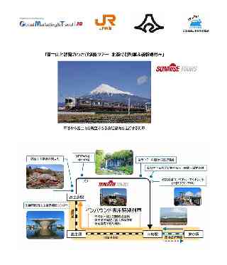 2025年11月27日 株式会社 JTB グローバルマーケティング&トラベル 東海旅客鉄道株式会社 静岡県 公益社団法人 静岡県観光協会 【共同リリース】 JTBGMTとJR東海がインバウンド専用特別列車を共同企画 2025年11月27日よりツアー商品発売開始 〜三島駅から富士宮駅への直通列車にて、車窓からの富士山を満喫〜 JTBグループでインバウンド(訪日)旅行を専門に扱う株式会社JTBグローバルマーケティング&トラベル(本社:東京都品川区、代表取締役社長執行役員:石田恒夫、以下「JTBGMT」) 及び東海旅客鉄道株式会社(本社:愛知県名古屋市、代表取締役社長:丹羽俊介、以下「JR東海」)は、訪日外国人観光客向けに、東海道本線から身延線へ直通運転し、車窓から富士山の景色を満喫いただける特別列車の運行を共同で企画しました。インバウンド専用特別列車の運行は、JR東海にとって初の試みであり、JTBGMTが主催する訪日外国人観光客向けパッケージ旅行「サンライズツアー(SUNRISE TOURS)※1」にて、本列車への乗車を目玉とした新ツアー「富士山と静岡のわさび堪能ツアー 北斎特別列車&新幹線付き」を2025年11月27日(木)より発売を開始します。 また、本ツアーにおいて、静岡県及び公益社団法人 静岡県観光協会は、JTBGMT及びJR東海と連携し、プロモーション等への協力を行っていきます。 ■企画の背景 サンライズツアーでは、これまで富士山と箱根方面を訪れるツアーを長年主催し、訪日外国人観光客のお客様に好評をいただいてきました。その中で、多くのお客様が、訪日目的として美しい日本の富士山を一目見たいという思いを持たれていることに着目し、静岡方面からも富士山の情景を楽しみつつ地域の魅力に触れられるルートの構築をかねてより構想してきました。 またJR東海では、訪日外国人観光客のお客様に、東海道新幹線で静岡県にお越しいただき、さらに、在来線にもご乗車いただいて、車窓からの雄大な富士山を快適にお楽しみいただきたいという思いや、魅力ある観光資源を有する静岡県内の富士山麓を、より便利に周遊いただきたいとの思いがありました。 そしてこの度、JTBGMTとJR東海との連携により、美しい富士山を臨むインバウンド専用特別列車の運行及びツアーを企画することに至りました。 ■本ツアーの特徴 1. ユニークな観光コンテンツの開発 特別列車の車内は、富士山と葛飾北斎が描く富嶽三十六景を満喫する「美術館列車」をコンセプトとし、関連する絵画を飾ることで葛飾北斎の世界観へ誘い、通訳案内士の英語でのガイディングにより、その世界観を存分にお楽しみいただけます。また、日本の絵画を身近に感じていただけるようポストカードのプレゼントも用意しています。日本が世界に誇る鉄道を移動手段としてだけでなく、ユニークな観光コンテンツとして磨き上げ、世界中にアピールしていくことで、日本の列車観光の価値を高めていければと考えています。 2. 地域の歴史や文化的価値の再発見と地域への人流創出 本企画においては、地域の歴史や文化的価値を再発見し、訪日外国人に隠れた地域の魅力を実感していただけるツアーづくりにこだわりました。列車から眺める富士山の美しい情景や浮世絵を通じた日本の絵画文化に触れていただくことで、静岡県の歴史や文化への理解を深めていただきます。そして、訪日外国人が個人で手配したり旅行したりすることが容易ではなかった地域への人流創出を実現します。 3. 富士山を眺望する、JR東海として初めてとなるインバウンド専用特別列車 東海道新幹線から見る富士山の美しさは有名ですが、並行して走る東海道本線や、富士山の西麓を走る身延線からも雄大な富士山を堪能できます。そして、今回、東海道本線から身延線への直通列車を新たに設定し、「三島駅」から「富士宮駅」まで乗り換えなしで富士山を満喫いただける、JR東海として初めてとなるインバウンド専用特別列車を企画しました。途中の東海道本線「東田子の浦駅」では北側の車窓から、また、身延線「富士根駅」では東側の車窓から、富士山を撮影していただけるフォトセッションの停車時間を設けています。さらに、身延線内では、富士山の景色をゆっくりと観賞いただけるよう、一部区間にて徐行運転も行います。 ■ツアー内容 ・商品名:富士山と静岡のわさび堪能ツアー 北斎特別列車&新幹線付き ・行程:東京駅発 ⇒ [東海道新幹線] ⇒ 三島駅 ⇒ [インバウンド専用特別列車] ⇒ 富士宮駅 ⇒ 静岡県富士山世界遺産センター ⇒ 富士山本宮浅間大社 ⇒ 白糸の滝・音止の滝 ⇒ ランチ ⇒ わさび田見学と擦りおろし体験・試食体験 ⇒ 御殿場プレミアム・アウトレットにて一部下車 ⇒ 三島駅 ⇒ [東海道新幹線] ⇒ 東京駅着 ・インバウンド専用特別列車の運行区間: 東海道本線「三島駅」→身延線「富士宮駅」 (直通) ・設定日:2026年3月19日(木)〜12月22日(火)までの毎週火・木・土曜日 (一部除外日あり) ・最少催行人員:2名、 申込受付最大人員:80名 ・ツアー詳細: https://www.jtbg