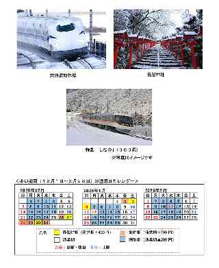 ・冬の期間の適用日カレンダーは以下の通りです。ご利用日を少しずらしていただくことでお求めやすい価格となることもありますので、ご検討ください。なお、年末年始期間(12月26日〜1月4日)において新幹線「のぞみ」及び特急「しなの」「ひだ」「南紀」は「全席指定席(自由席設定なし)」で運転します。