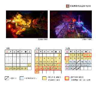 2025年 9月24日 嵯峨野観光鉄道株式会社 『光の幻想列車』の運行について 〜車窓から見る「ライトアップ&イルミネーション」〜 嵯峨野観光鉄道株式会社では、毎年ご好評いただいているトロッコ列車沿線のライトアップ&イルミネーションを、今年も実施いたします。『光の幻想列車』と題し演出した沿線では、約1000台の照明に照らされる美しい紅葉、色彩豊かな光によってさらに神秘的な姿を見せる山々、きらめく川面など、まさに「幻想的」な光景をお楽しみいただけます。 今年も、沿線を熟知した社員によって、お客様により一層美しく幻想的な時間をお過ごしいただけるよう照明を施します。進化を続ける『光の幻想列車』、期間中はより多くのお客様にご乗車いただけるよう「臨時列車」を運行いたしますので、この機会に是非お越しください。 1. 実施日等 (1)点灯日時 : 2025年10月25日(土)〜12月29日(月) 16時30分〜最終列車まで ※運休日(12月17日(水))を除く (2)期間中に運行する臨時列車 列車名 嵯峨野81号、嵯峨野82号 運転日 2025年10月25日(土)〜12月14日(日) ■嵯峨野81号 ┌────────┬────────┬─────────┬────────┐ │トロッコ嵯峨(発)│トロッコ嵐山(発)│トロッコ保津峡(発)│トロッコ亀岡(着)│ ├────────┼────────┼─────────┼────────┤ │ 17:10 │ 17:13 │ 17:24 │ 17:38 │ └────────┴────────┴─────────┴────────┘ ■嵯峨野82号 ┌────────┬────────┬─────────┬────────┐ │トロッコ亀岡(発)│トロッコ保津峡(発)│トロッコ嵐山(発)│トロッコ嵯峨(着)│ ├────────┼────────┼─────────┼────────┤ │ 17:43 │ 17:55 │ 18:09 │ 18:12 │ └────────┴────────┴─────────┴────────┘ 以下の運転日は、臨時列車をさらに1往復運転いたします。 列車名 嵯峨野91号、嵯峨野92号 運転日 2025年11月22日(土)〜30日(日)、12月5日(金)〜7日(日) ■嵯峨野91号 ┌────────┬────────┬─────────┬────────┐ │トロッコ嵯峨(発)│トロッコ嵐山(発)│トロッコ保津峡(発)│トロッコ亀岡(着)│ ├────────┼────────┼─────────┼────────┤ │ 18:26 │ 18:29 │ 18:42 │ 19:00 │ └────────┴────────┴─────────┴────────┘ ■嵯峨野92号 ┌────────┬────────┬─────────┬────────┐ │トロッコ亀岡(発)│トロッコ保津峡(発)│トロッコ嵐山(発)│トロッコ嵯峨(着)│ ├────────┼────────┼─────────┼────────┤ │ 19:10 │ 19:26 │ 19:42 │ 19:45 │ └────────┴────────┴─────────┴────────┘ 〔補足〕嵯峨野16号(トロッコ亀岡駅16時30分発)以降、ライトアップ及びイルミネーションをご覧いただけます。 2. 購入方法 ご乗車日1か月前の午前0時より、弊社公式ホームページよりご購入いただけます。 公式ホームページ:https://www.sagano-kanko.co.jp/ ※トロッコ列車各駅の窓口では、事前販売は行いません。 ※トロッコ列車各駅(トロッコ保津峡駅除く)の窓口では当日券の販売を行いますが、満席によりご乗車いただけない場合がございます。 3. その他 ・例年ご好評いただいております「クリスマスロマンティックトレイン」につきましては、詳細が決まり次第、改めてお知らせいたします。 |