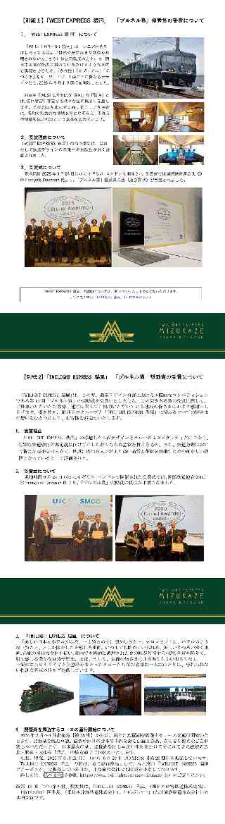※「TWILIGHT EXPRESS瑞風」は、「TRAIN SUITE四季島」(東日本旅客鉄道株式会社)、「36ぷらす3」(九州旅客鉄道株式会社)との共同受賞になります。